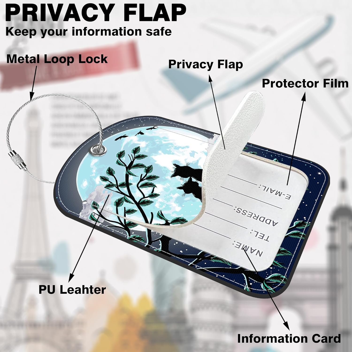 2 Pack Luggage Tag for Suitcase Cat Under The Moon Leather Suitcase Tags with Privacy Name ID Label and Stainless Steel Loop for Travel Bag