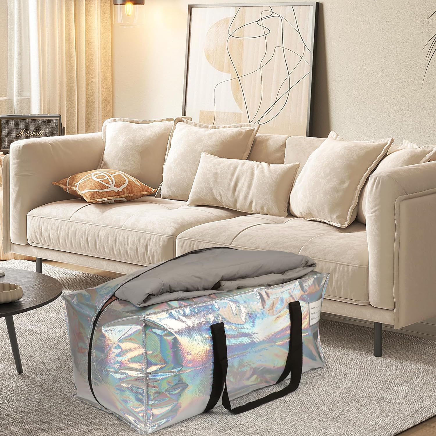 2 Pack Heavy Duty Moving Bags Extra Large Waterproof Foldable Clothing Storage Totes Bags with Zipper, Reinforced Handles, Packing Moving Boxes for Dorm & Seasonal Storage, Iridescent