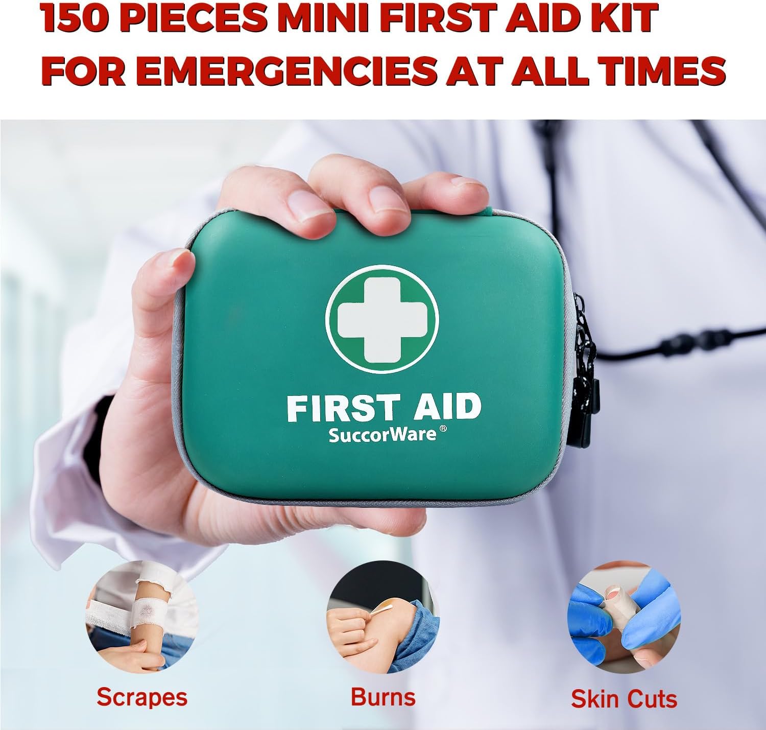 150 Pieces Mini First Aid Kit - Small Medical Kit with Hard Shell - Emergency First Aid Kit for Car, Travel, Home, Outdoor, Office, Camping, Hiking (Green)