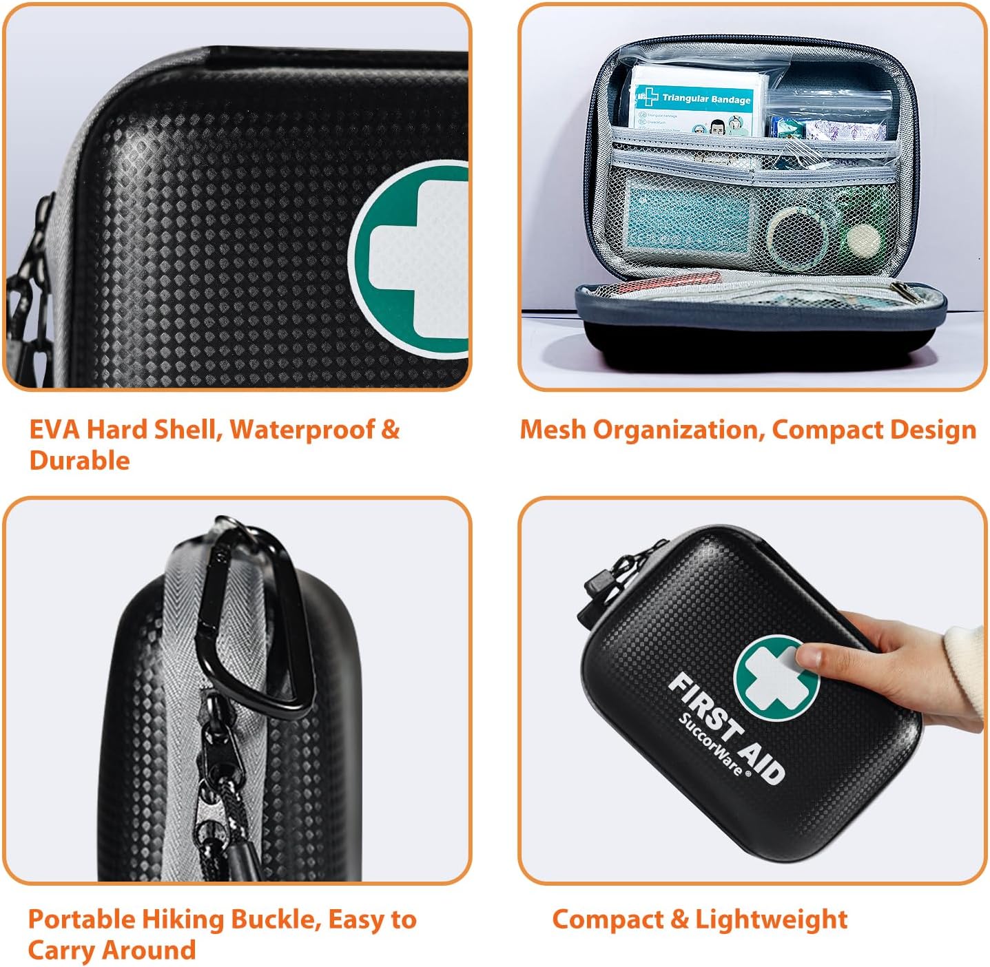 - WATERPROOF & DURABLE - Emergency kit is made of EVA hardshell material on the surface, which is waterproof and adds durability to the bag. Quality double zippers and extra hiking buckles add convenience for outdoor activities.