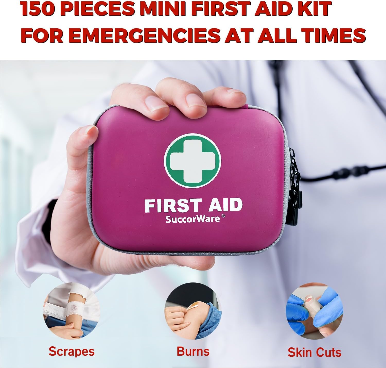 150 Pieces Mini First Aid Kit - Small Medical Kit with Hard Shell - Emergency First Aid Kit for Car, Travel, Home, Outdoor, Office, Camping, Hiking (Purple)