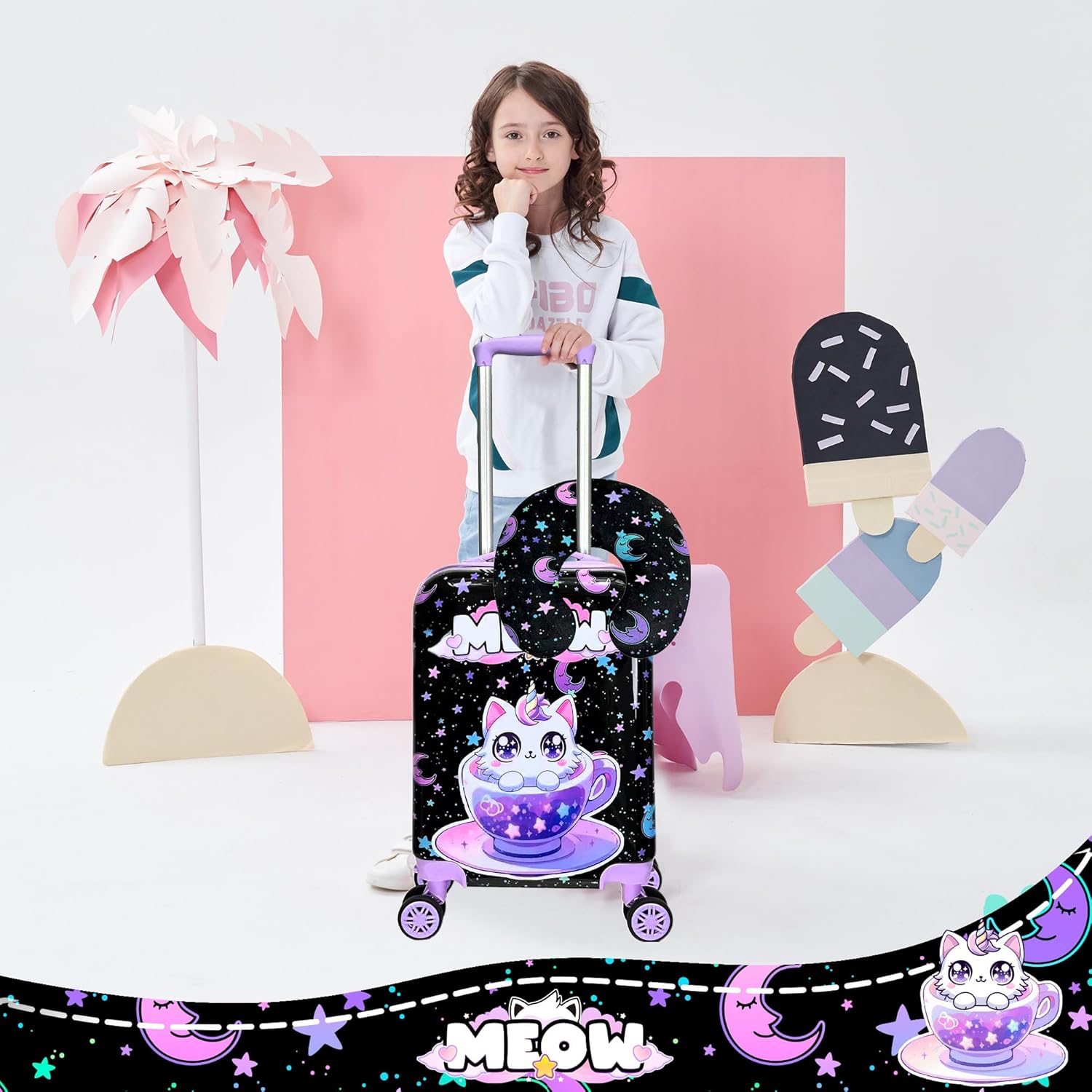 Cute Black Cat Kid's Luggage Set 2 Piece Suitcase Set 16" Hardside Luggage with Spinner Wheels Girls Carry on Toddler Travel Rolling Luggage Airline Approved