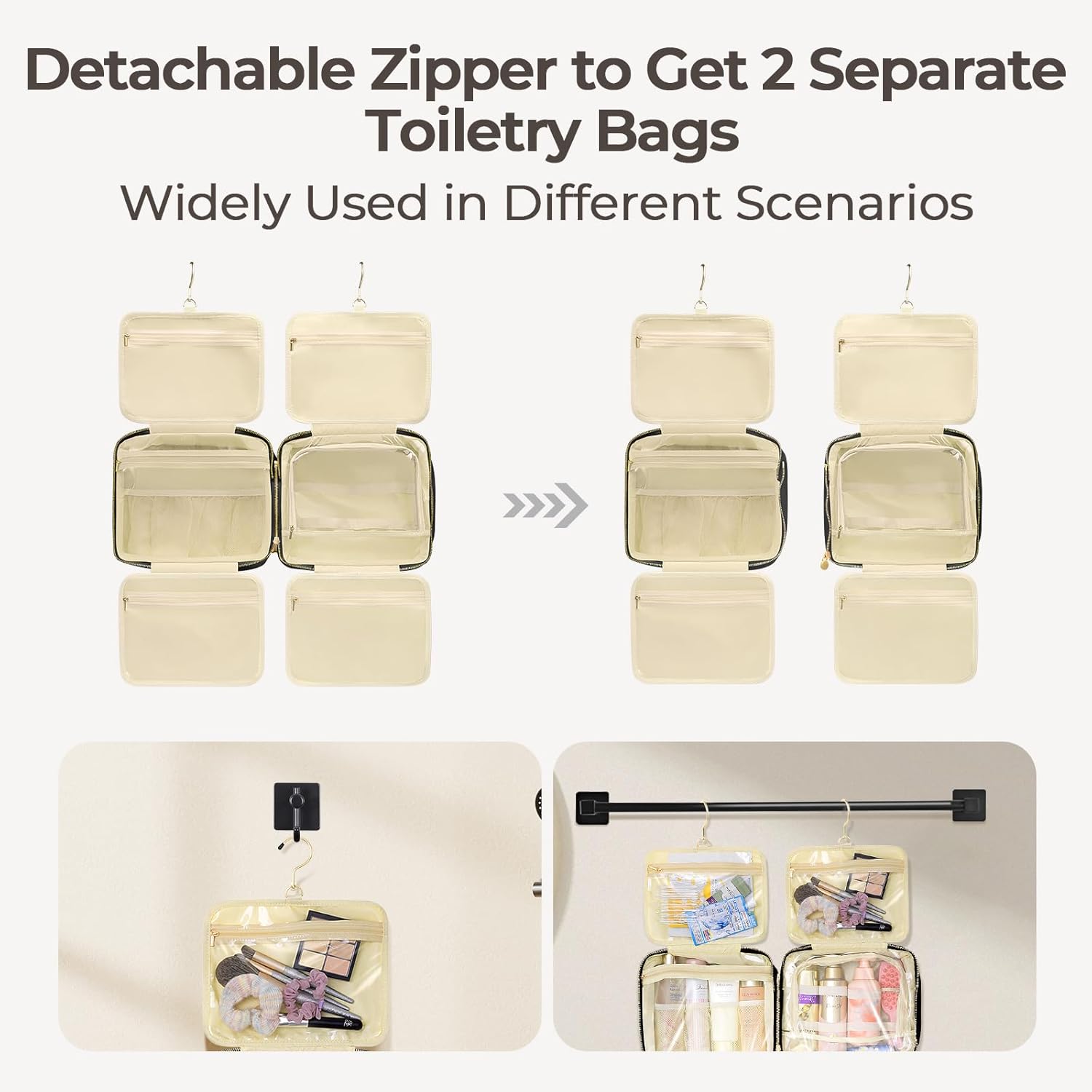 - 【3-in-1 Detachable Travel Toiletry Bag】Don't worry about toiletry bags of 2 hooks that are not easy to hang! JIECH travel toiletry bag for women uses detachable design, so you can use the hanging toiletry bag separately with single hook, more importantly, with this amazing design, You can organize your toiletries and makeup separately to keep your travel essentials more organized. Pack everything you need, from shampoo and lotion to toothpaste, toothbrushes, hairbrush, and makeup—no problem!