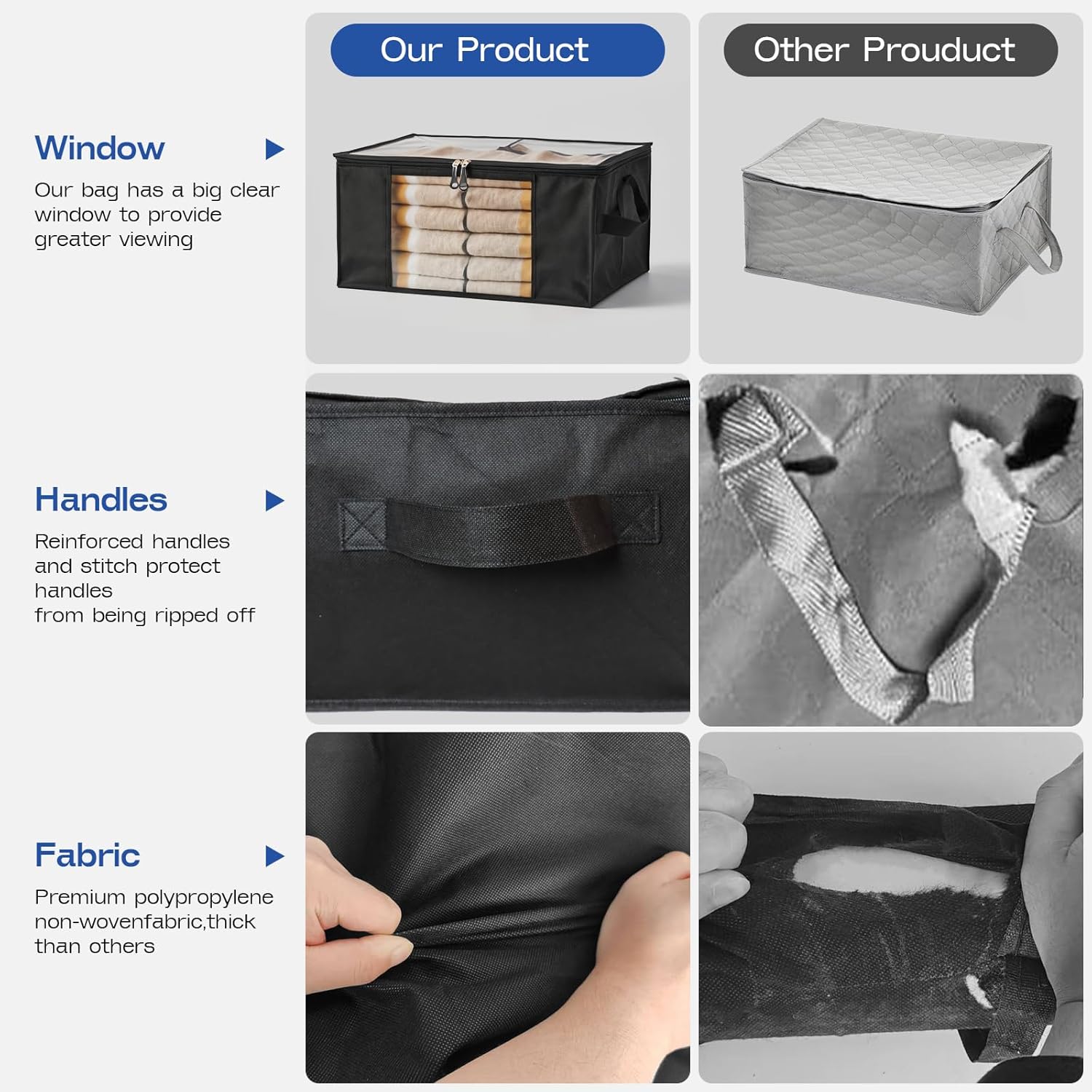 Clothes Storage Bags, Foldable Thick Fabric Blanket Storage Bags, Large Clear Window & Carry Handles, Great for Clothes, Blankets, Closets, Pillows, Toys (Black, 4PACK)
