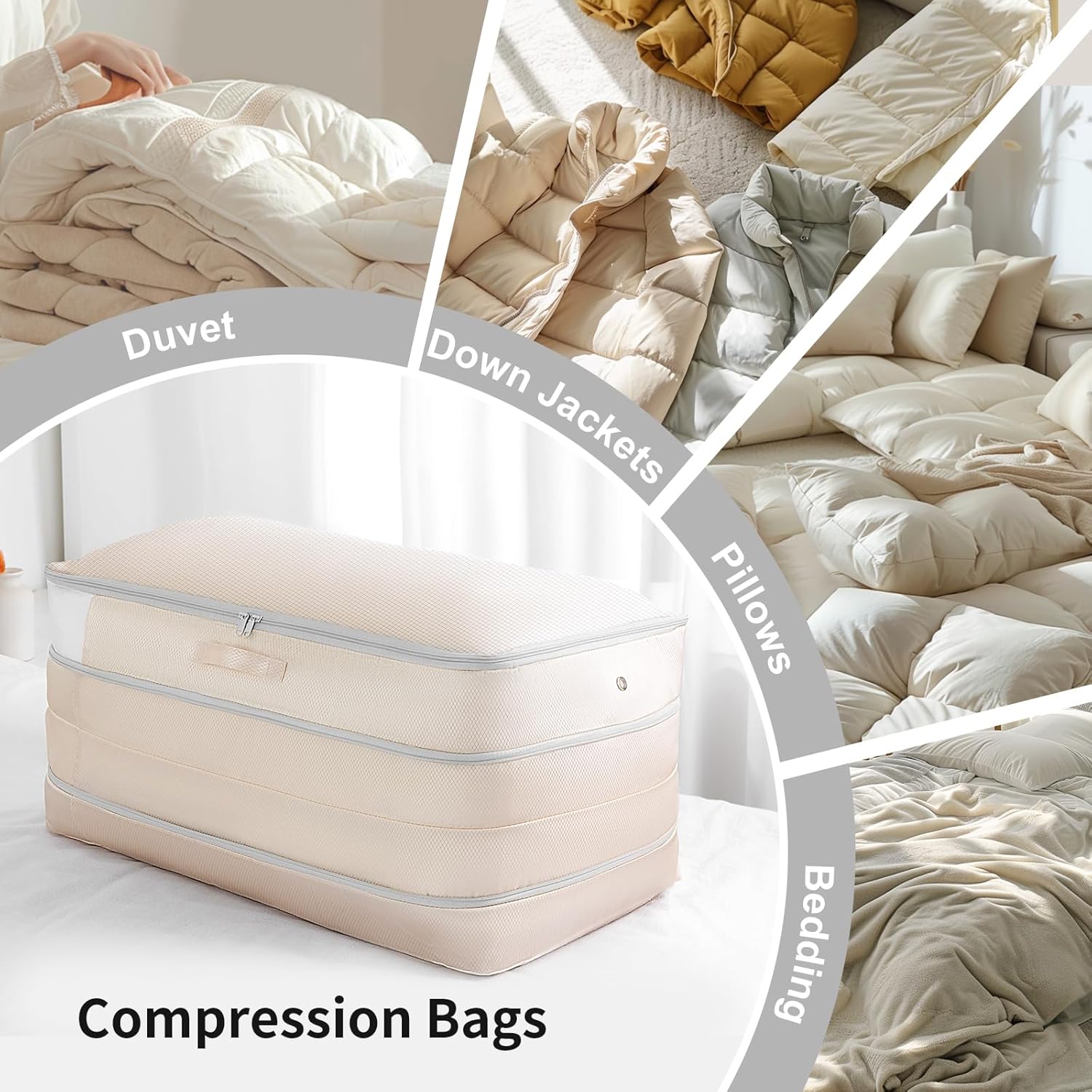 Comforter Storage Bag - Large Capacity Bedding Storage Bags Ultra Space Saving Self Compression Organizer, Washable Compression Bags for Storage Comforter Blanket Duvet Pillow, 2-Pack, Beige