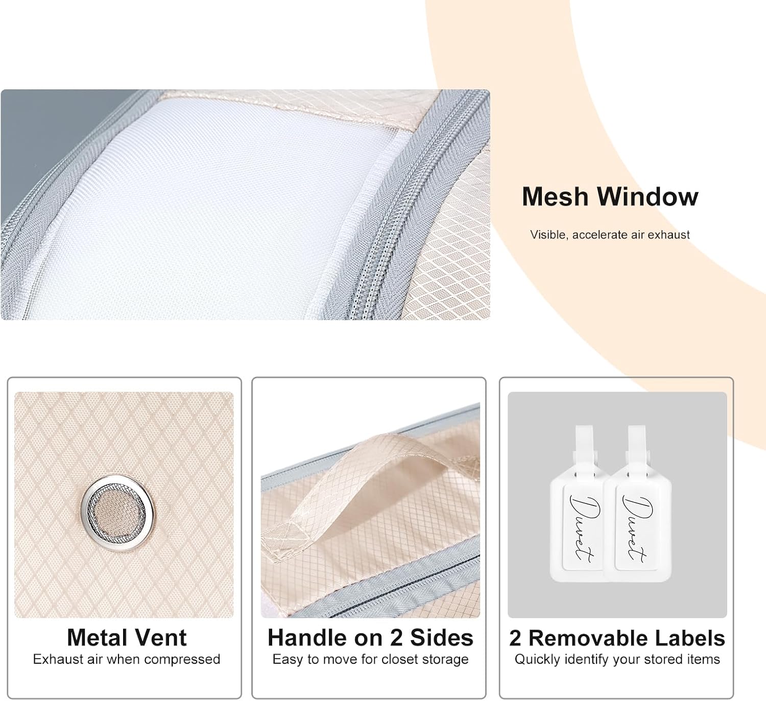 - [Mesh Window and Customizable Labels]Featuring a mesh viewing window on the side, you can quickly see what's inside without opening the bag while providing better breathability. Each compression storage bags for bedding also comes with a removable label card, so you can easily mark and organize your stored items