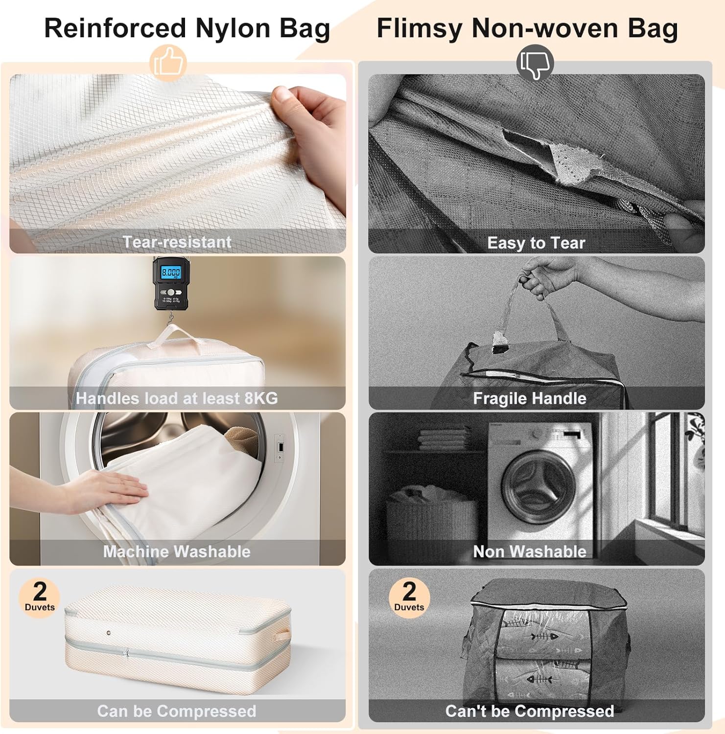 - [Washable & Tear-Resistant for Long-Lasting Use] Unlike non-woven bags and ordinary compression quilt bags,crafted from tear-resistant nylon fabric, our compression bags for storage are washable, odor-free, and slightly water-resistant. These features ensure that your bedding storage remains safe from dust, moisture, and wear, making it the ideal choice for protecting your household items long-term