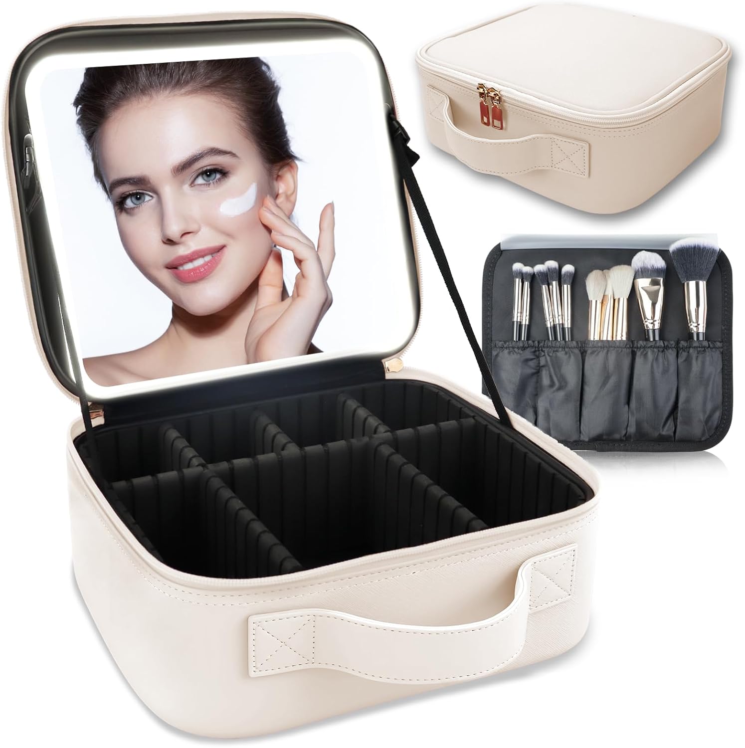 Makeup Bag with Led Mirror,Travel Makeup Organizer with 3 Color Setting, Portable Storage and Adjustable Dividers Travel Makeup Bag(White)