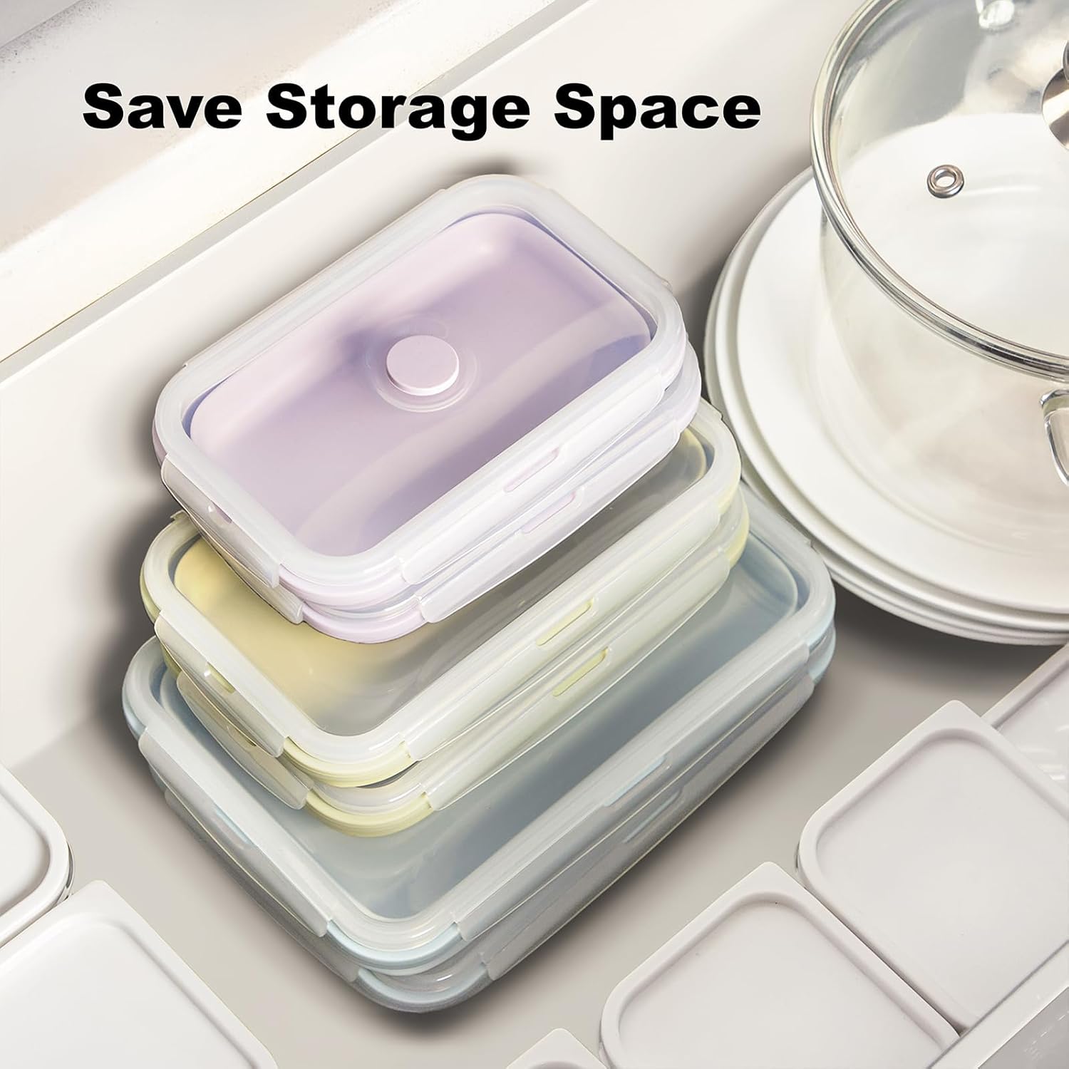 - SPACE SAVING: The kitchen foldable storage containers are made of food-grade silicone material, which is soft and not easy to break. The foldable design saves nearly 60% of space. They will keep your cabinets, pantry and refrigerator organized.