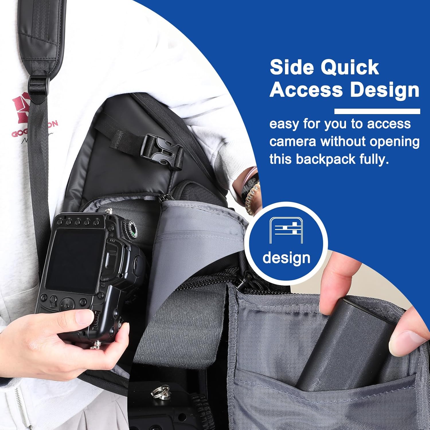 - Fully open design, convenient for you to organize the internal space and store different sizes of cameras and lenses. Side quick access design is easy for you to put and access camera without opening this backpack fully. Tripod/monopod holder is featured with 1 secure strap on one bag side. 2 pockets on the side can store umbrella or water bottle. Waterproof rain cover included can fully protect the whole bag from rainwater, keep your belongs not be wet.