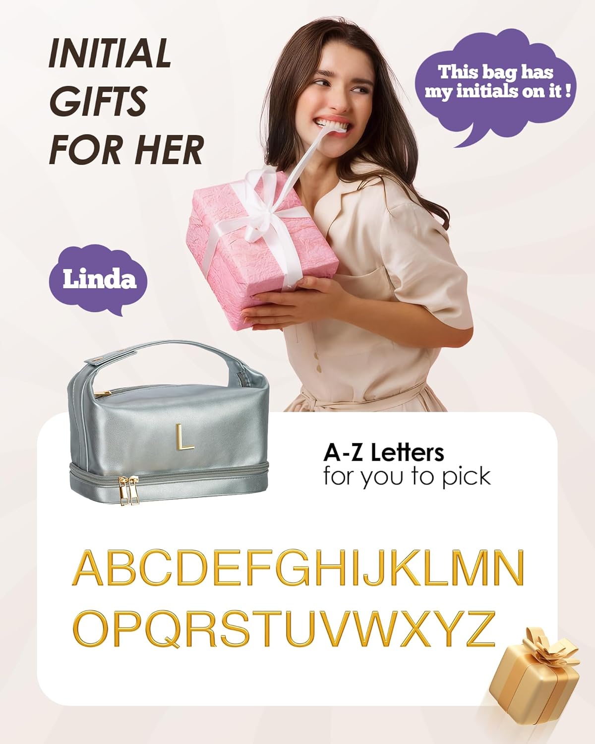 Teen Girl Gifts Trendy Stuff, Makeup Bags for Women with Handle, Initial Double Layer Cosmetic Bag with Makeup Brush Organizer, Cute Cosmetic Pouch for Women, Gifts for Friends Female Mom