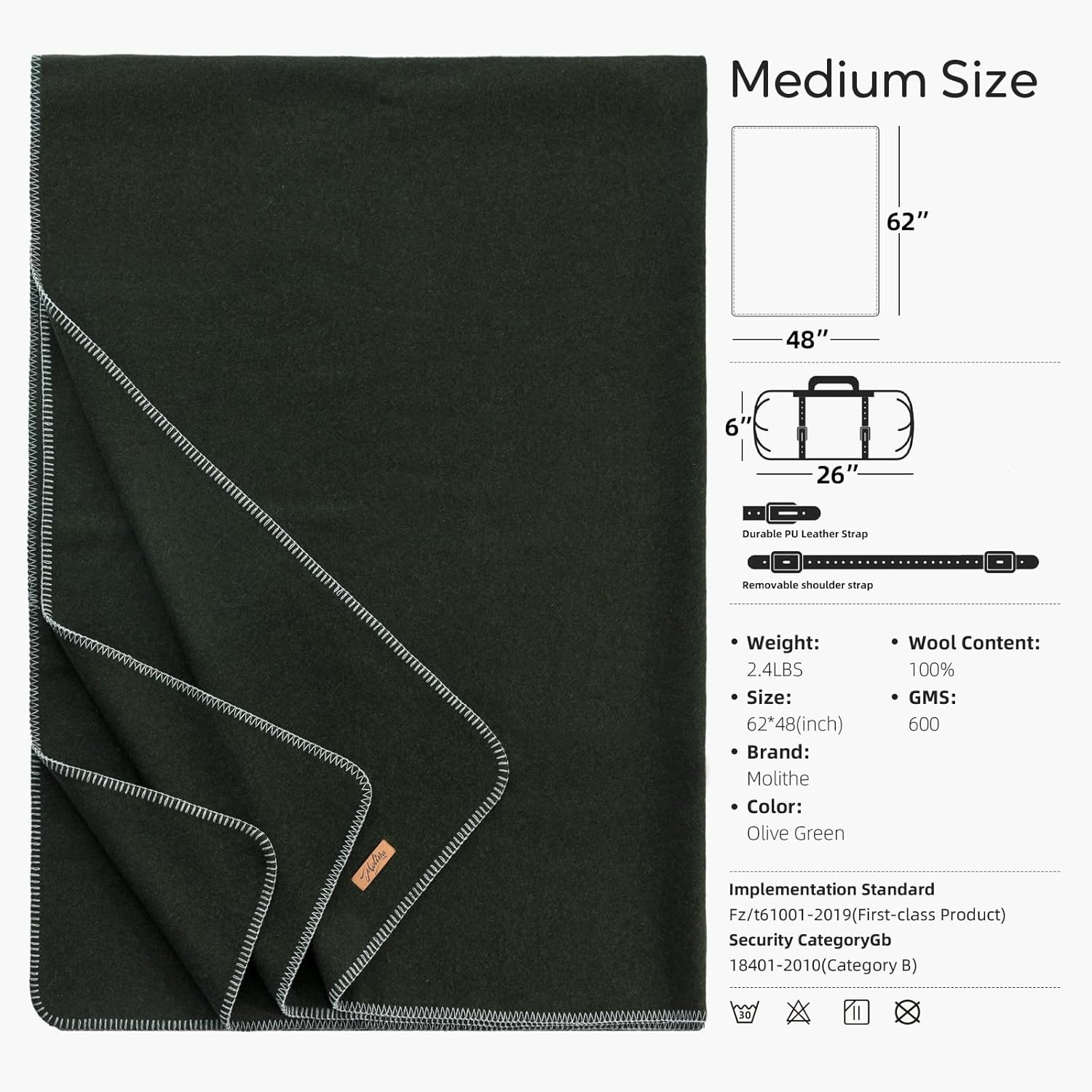 100% Wool Blanket, 48" x 62", Warm, Thick, Washable, Military Wool Blanket, Great for Camping, Outdoors, Sporting Events, Survival Kits,Olive Green