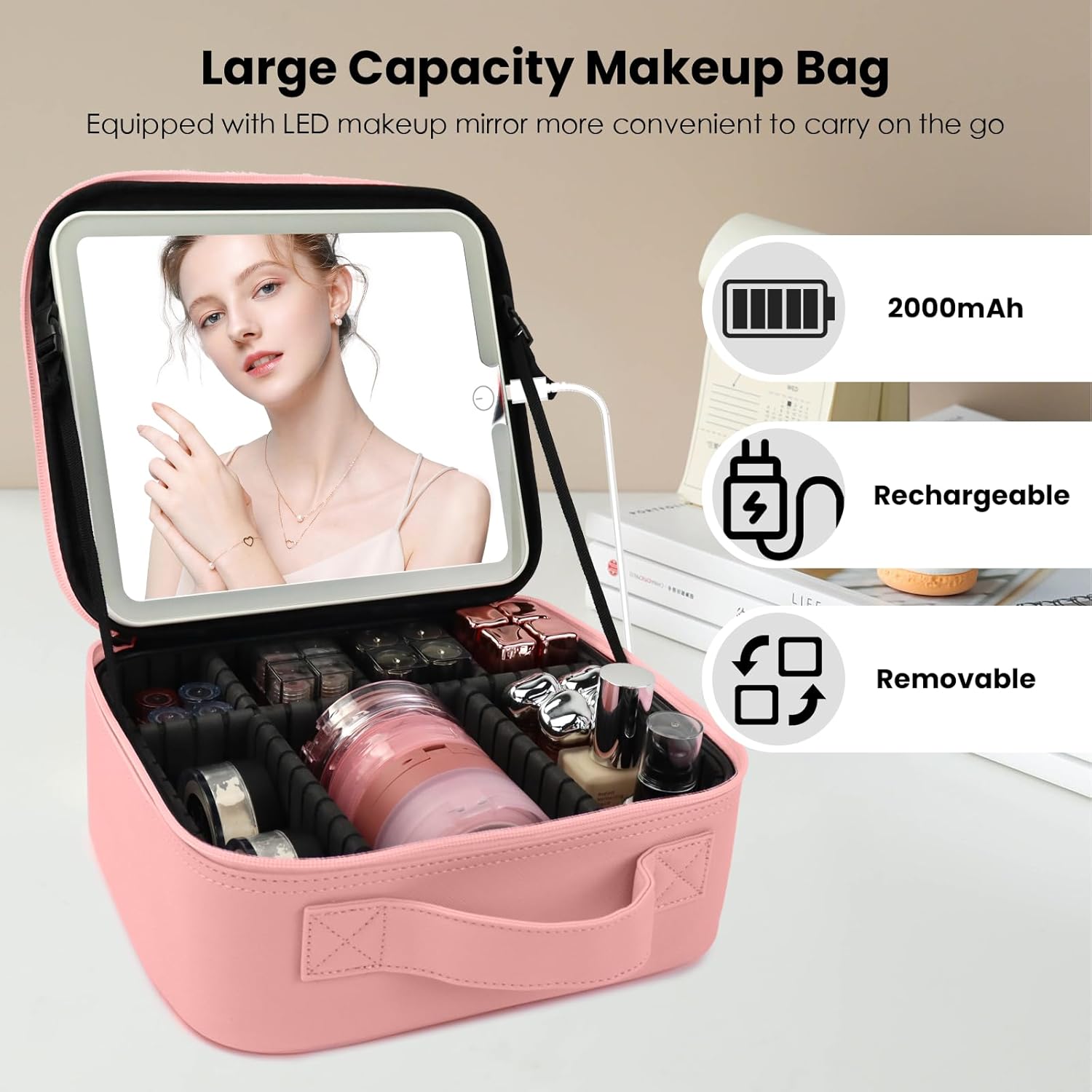 Travel Makeup Bag with LED Mirror Makeup Case with Light Up Mirror Portable Cosmetic Brush Organizer Bag with Adjustable Dividers for Cosmetics Makeup Brushes Toiletry (Pink)