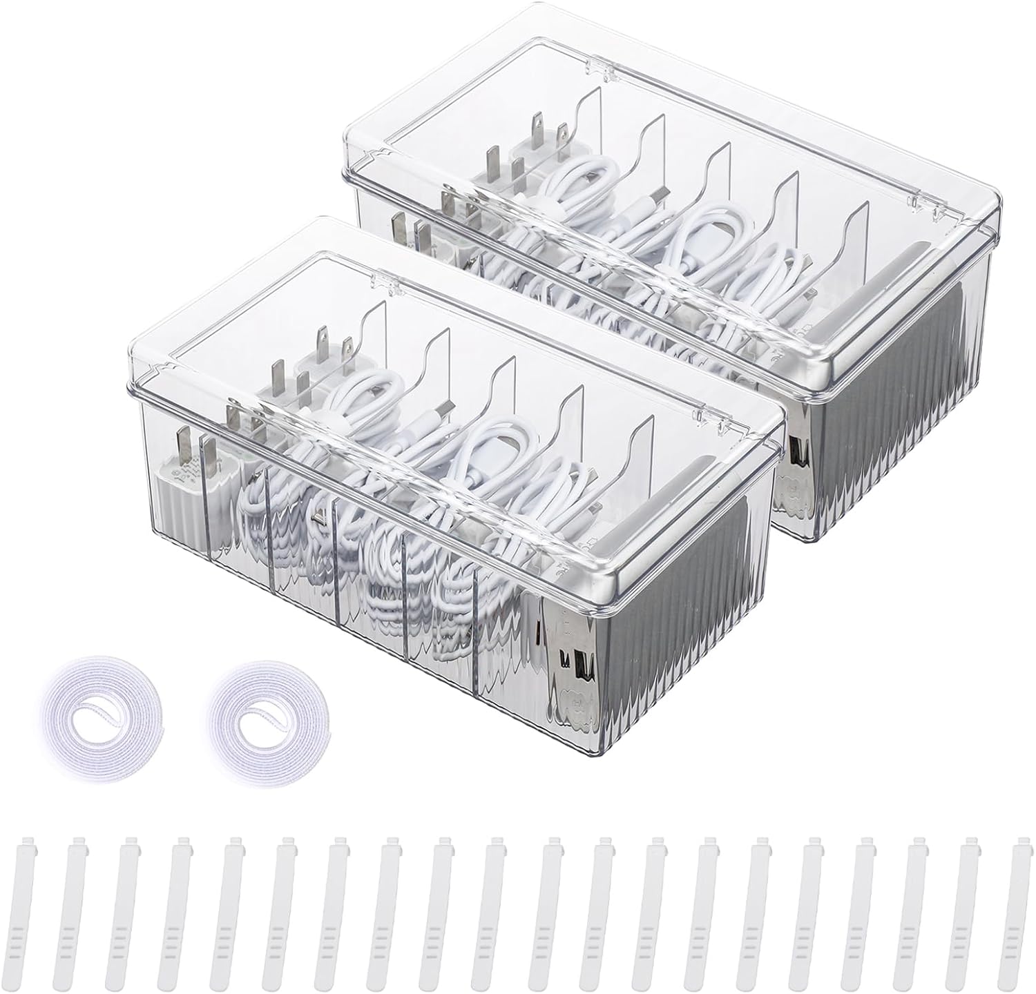 Yesesion Large Cord Organizer Box with Lid and 6 Compartments, 2 Pack Plastic Cable Storage Boxes with Wire Ties, Clear Desk Drawer Organizer for Phone Charger, Battery, Home Office Supplies