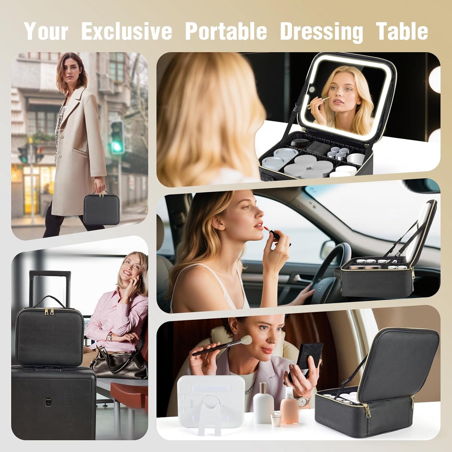 Makeup Bag with Removable Lighted Mirror, Travel Make up Bag with Lights Portable Makeup Case Organizer with Mirror 360° Adjustable Angle, Partitionable Cosmetic Bag Accessories Makeup Train Case Gift