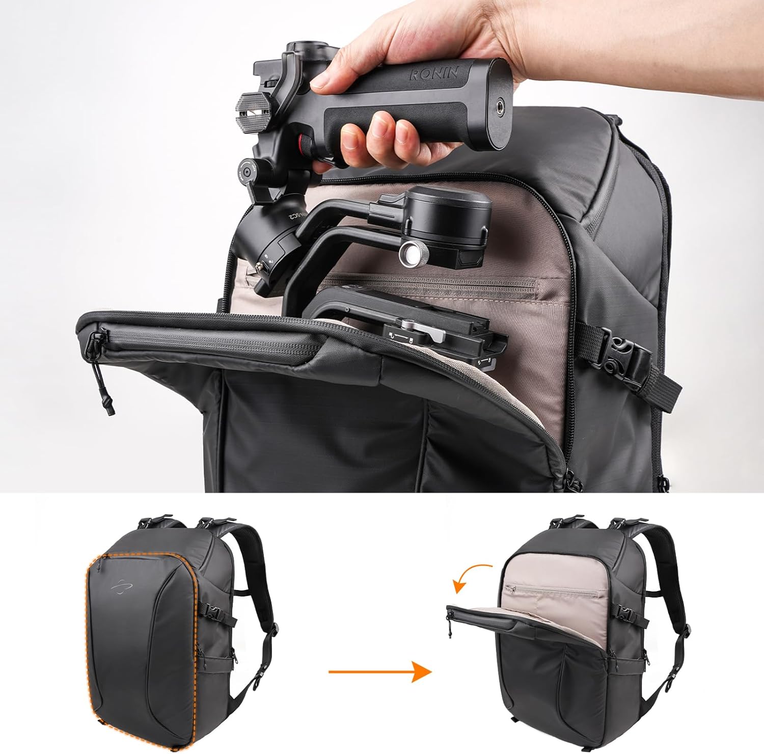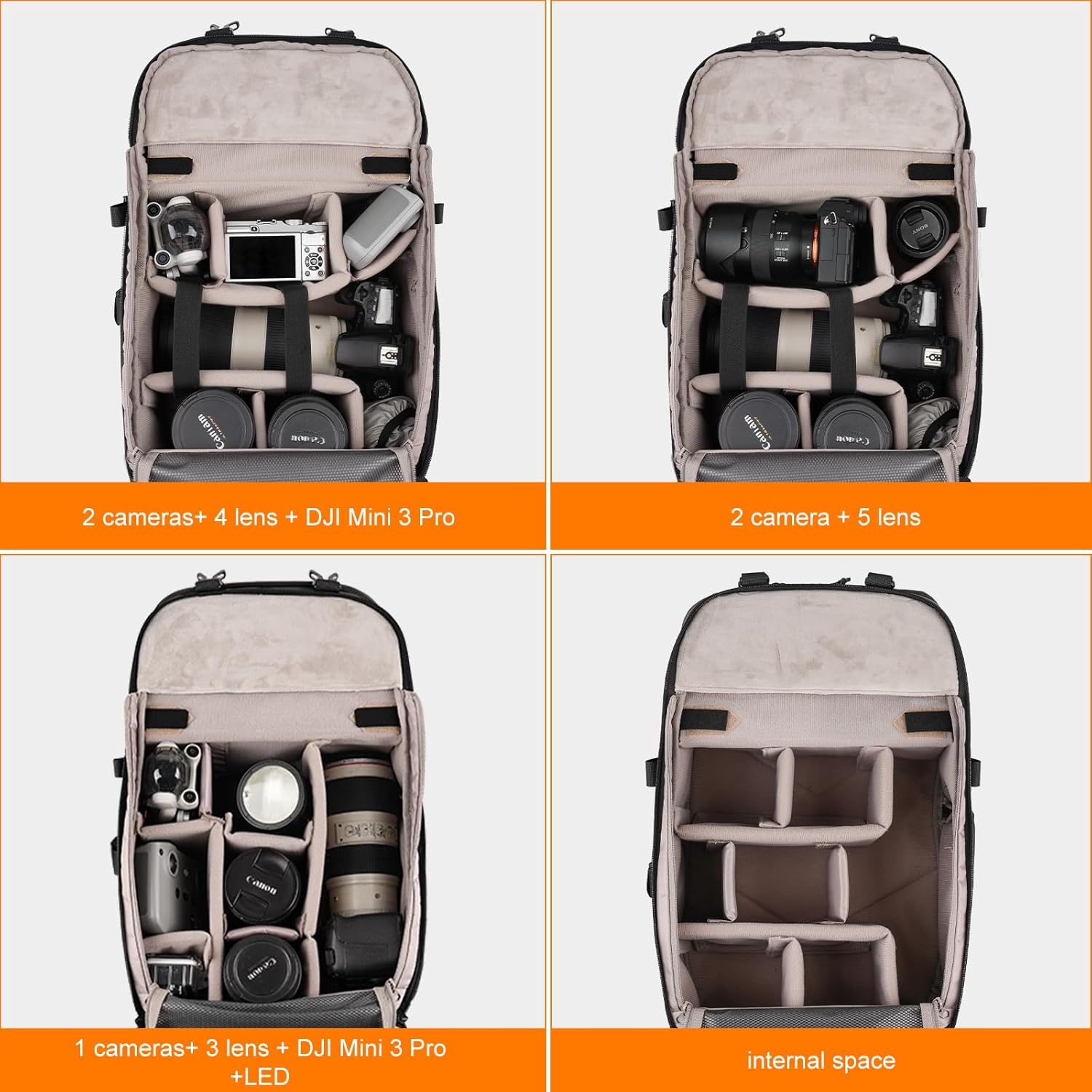 - Expandable Front Compartment - A big front pocket for small camera/phone stabilizers. You can also put some accessories in this pocket such as Power bank, data cable, notebook, etc.Inside laptop compartment fit up to 16 inch laptop,Between the laptop and camera compartments, there is a transparent mesh flap to avoid your camera gear fall out