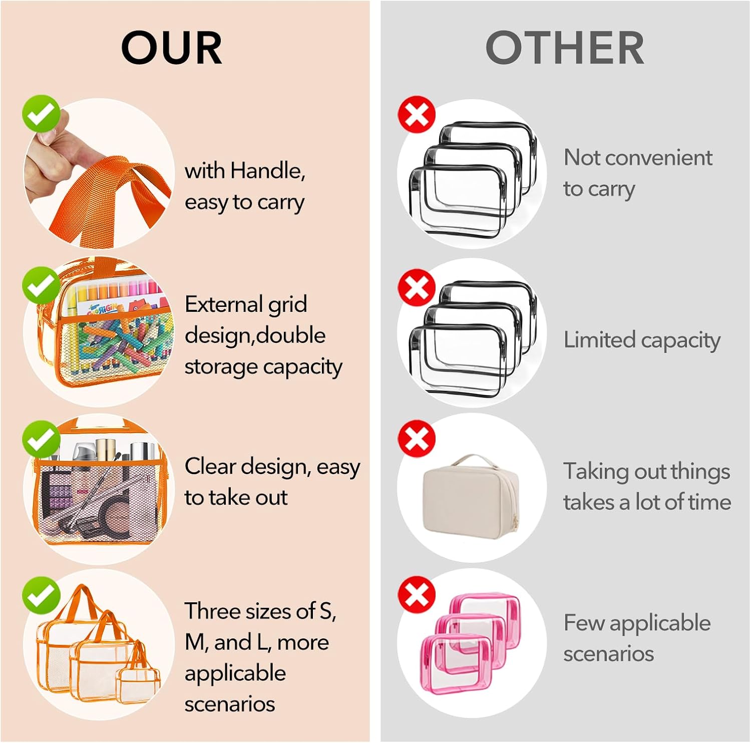 XEWEA Clear Travel Toiletry Bags, 3 Pack TSA Approved Transparent Makeup Bag for Men Women, Large Waterproof PVC Quart Organizer with Zipper for Toiletries Airline Essentials,Toy Storage Pouch Orange