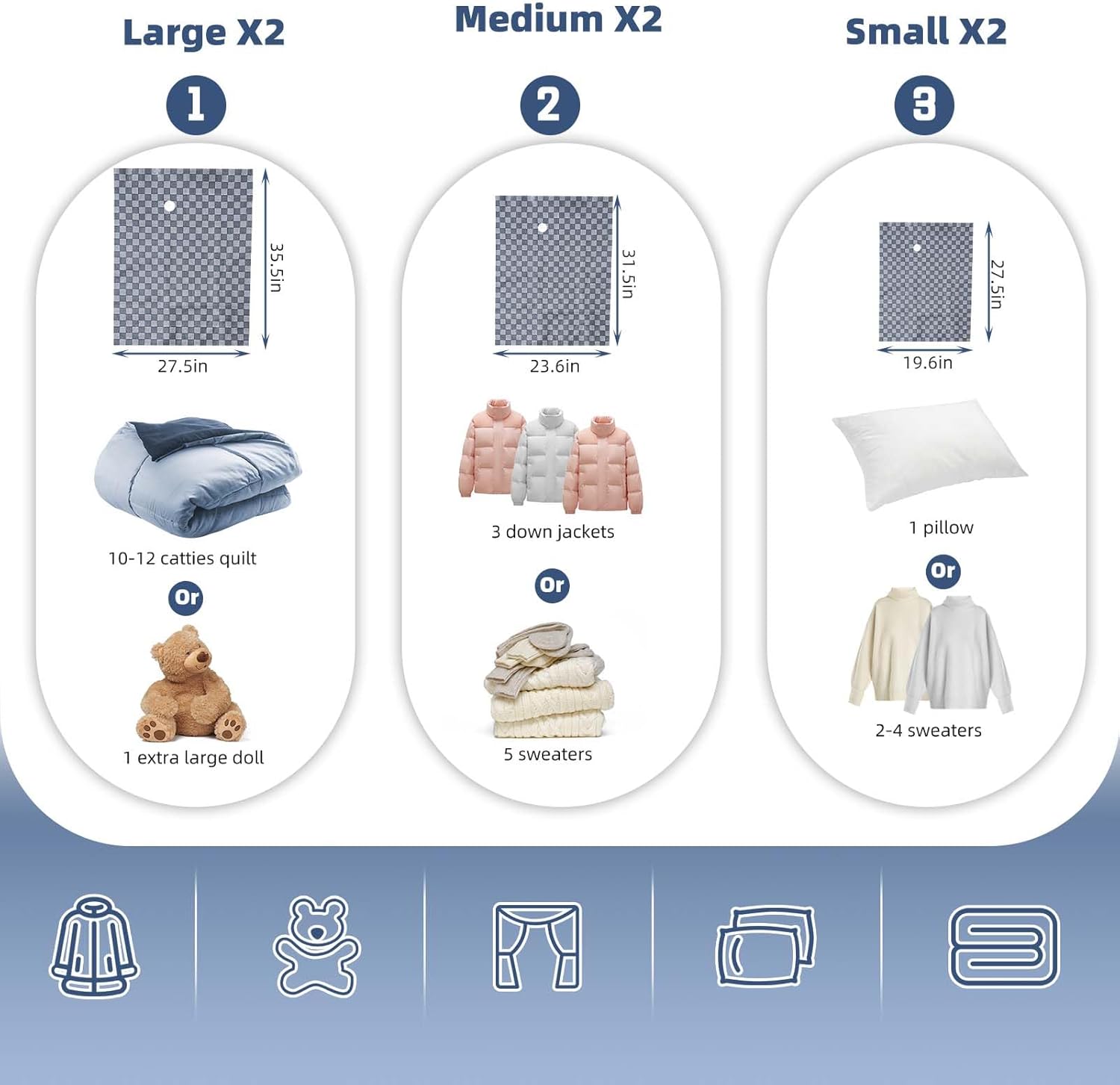- 【Multiple Size Options】—— The 6-pack of travel vacuum storage bags with USB electric pump includes 2 large (35.5×27.5 inches), 2 medium (31.5×23.6 inches), and 2 small (27.5×19.6 inches) bags, providing multiple storage solutions.