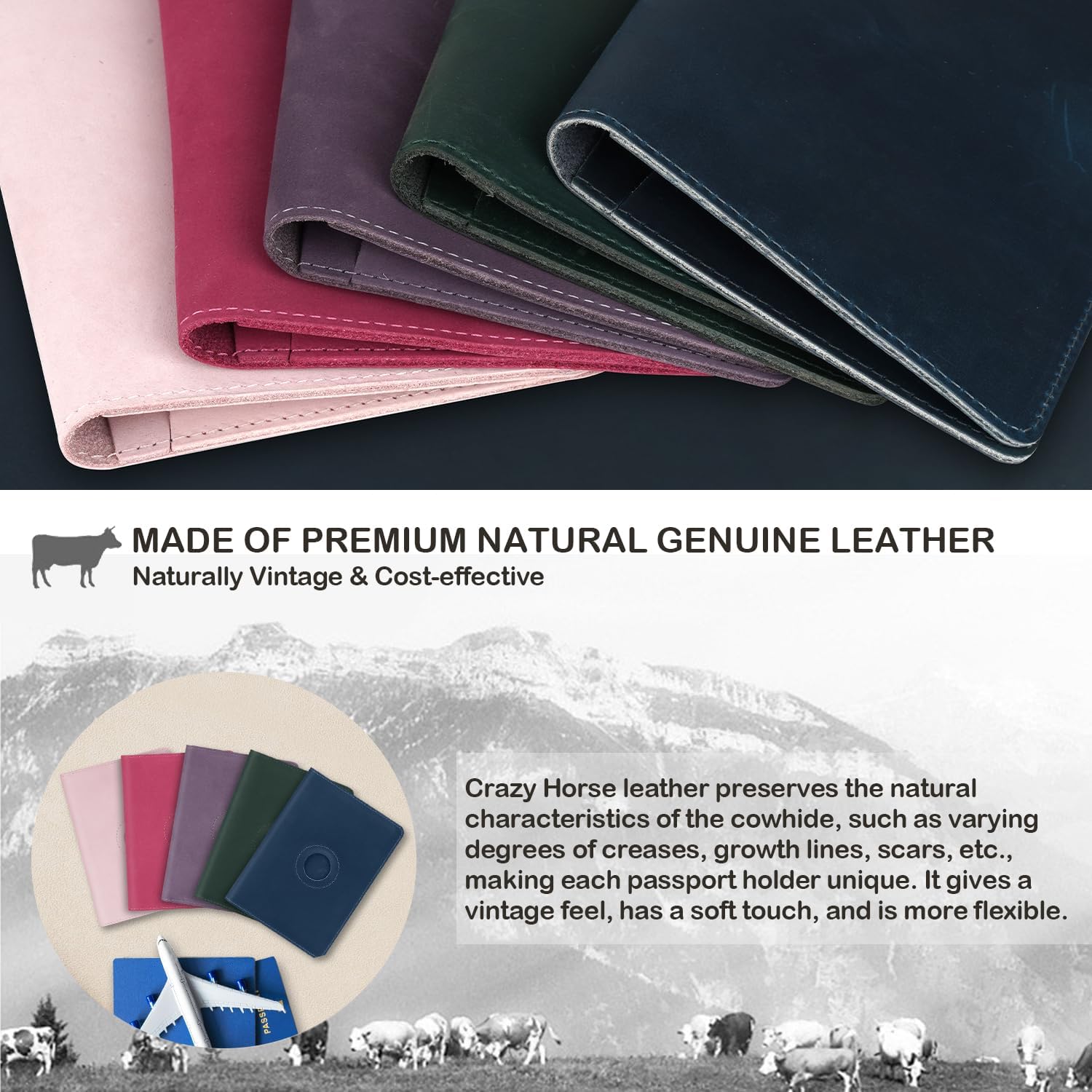 - GENUINE LEATHER: Our passport holder for travel is crafted from top-grain leather, offering high durability and great value for money. Crazy Horse leather maintains its uniqueness by preserving the natural characteristics of the cowhide, offering a natural vintage look and a soft touch. It naturally softens with wear and ages beautifully with time