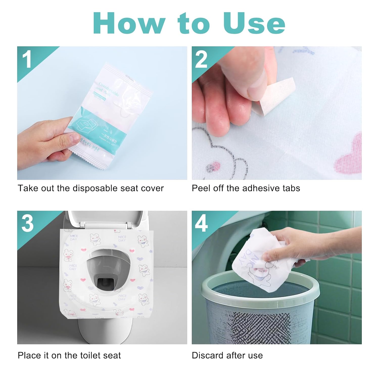 - Easy to Use: Simply open the package and remove the portable disposable toilet seat cover. After unfolding, peel off the 4 adhesive strips on the waterproof side and stick it on to the toilet seat to prevent it from slipping off. Once used, simply dispose of it.