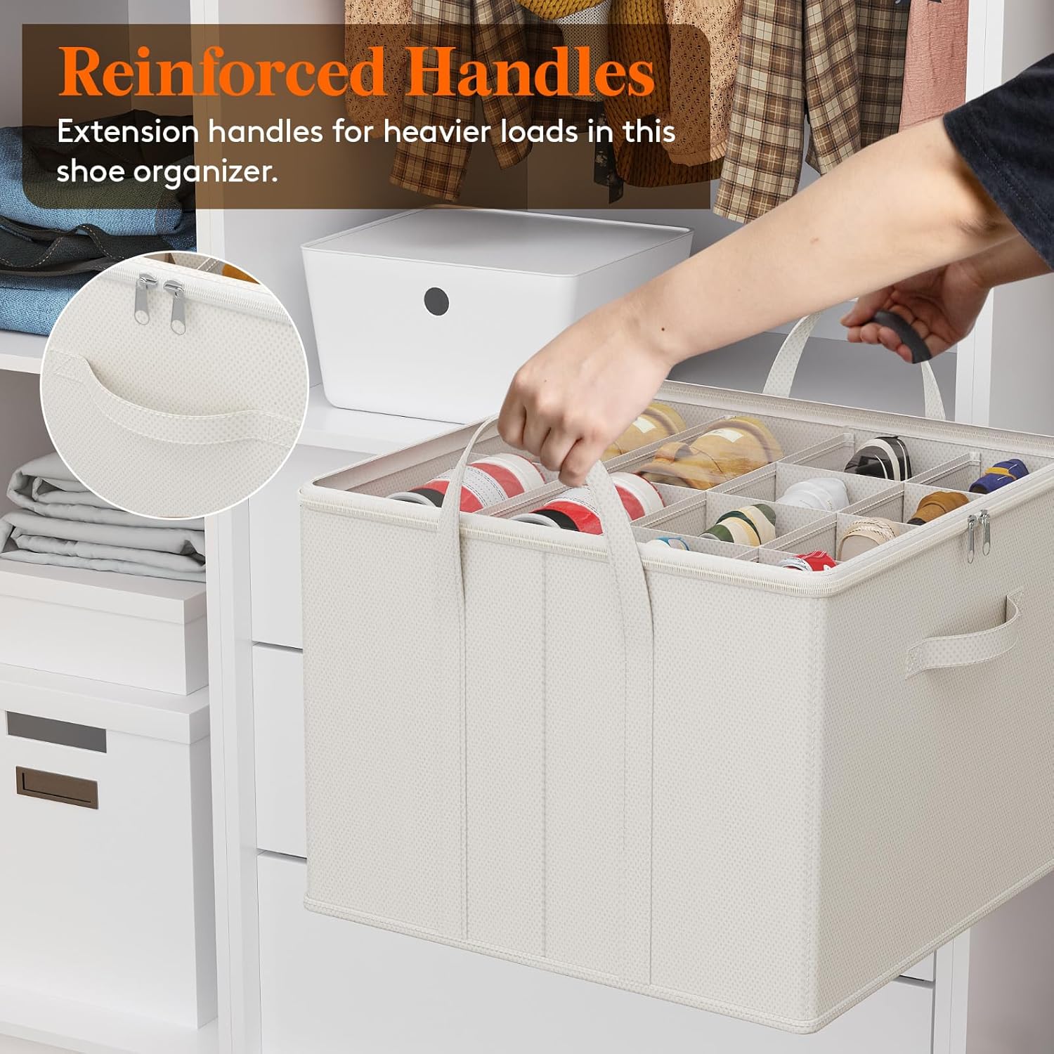 - Reinforced Structure: Equipped with three reinforced handles on the sides and front, this shoe storage box allows for easy pushing, pulling, or lifting, making it effortless to move around.Its strong side panels and bottom panel maintain its shape under pressure. The non-woven fabric design adds durability and dust resistance for reliable shoe support.