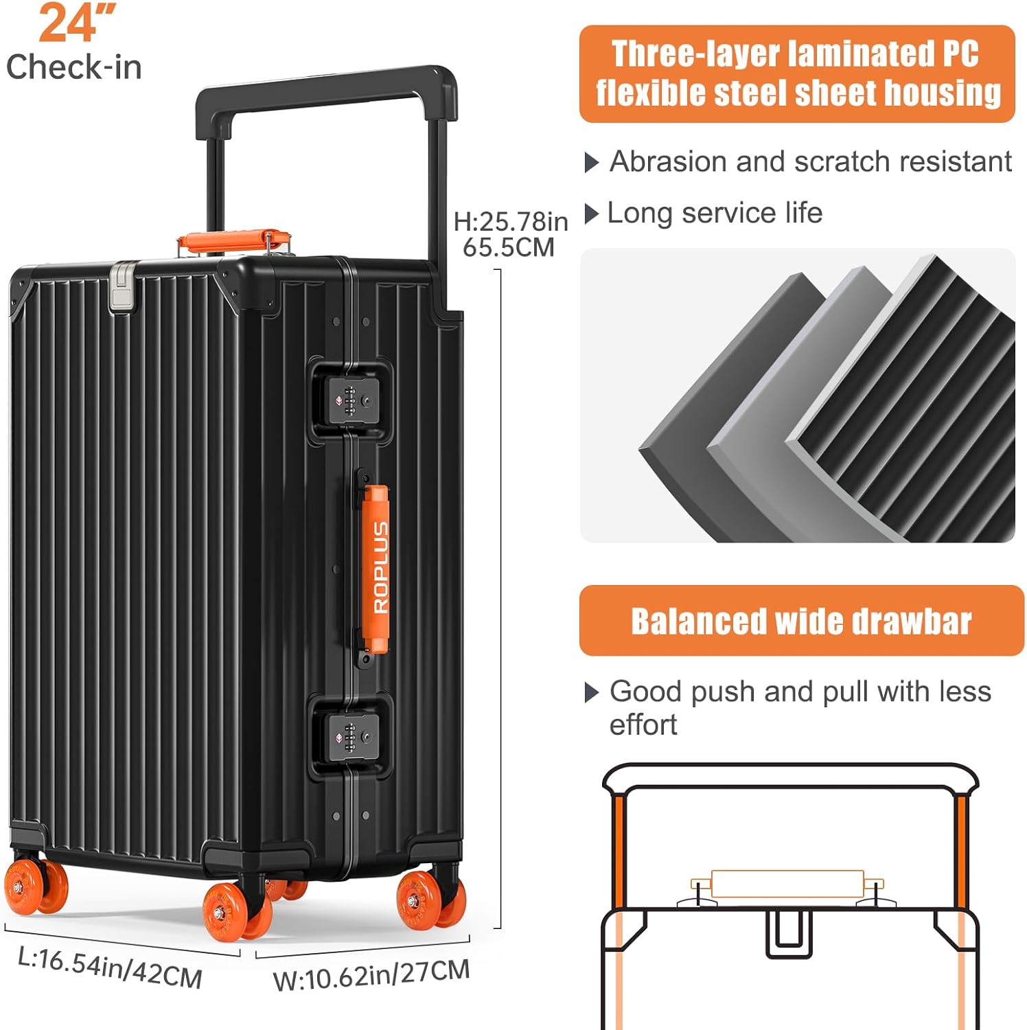 Aluminium Frame Checked-Luggage with Smooth Jelly Wheels, Hardside Zipperless Rolling Suitcase with TSA Lock (BlackOrange, 24-Inch)
