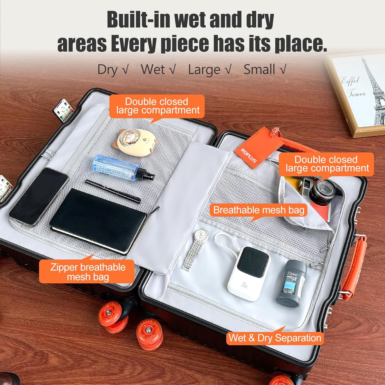 - LARGE STORAGE SPACE: Storage is the strength of this luggage. This aluminum framed suitcase has a large interior storage space with wet and dry compartments and two oversized zippered compartments for your laptop and more