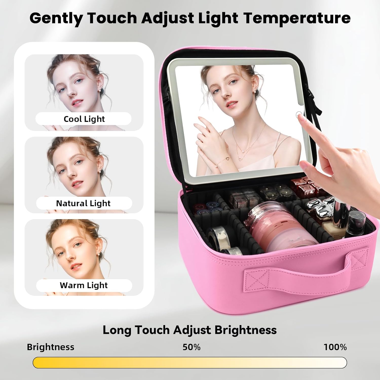 - 【Travel Makeup Bag with Led Mirror】Makeup case includes an 7.87 * 9in full-screen light mirror, Long press to control the brightness from 0% to 100% and gently touching the switch can easily adjust color temperature between cold light, natural light, and warm light, Can be attached to a makeup bag or placed on a desktop