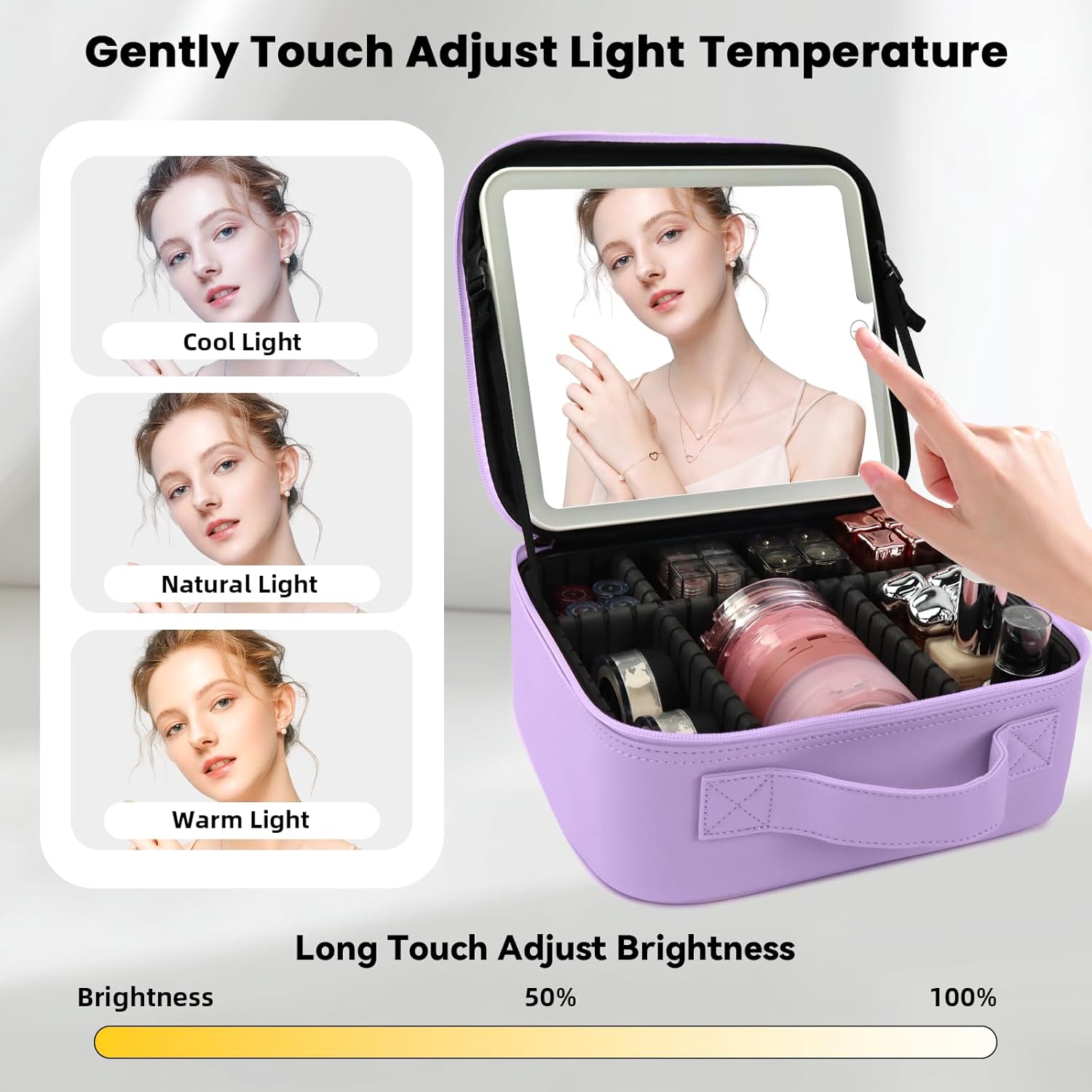 Travel Makeup Bag with LED Mirror and Light Travel Makeup Case Cosmetic Organizer Portable Cosmetic Brush Organizer Bag with Adjustable Dividers for Cosmetics Makeup Brushes Toiletry(Purple)