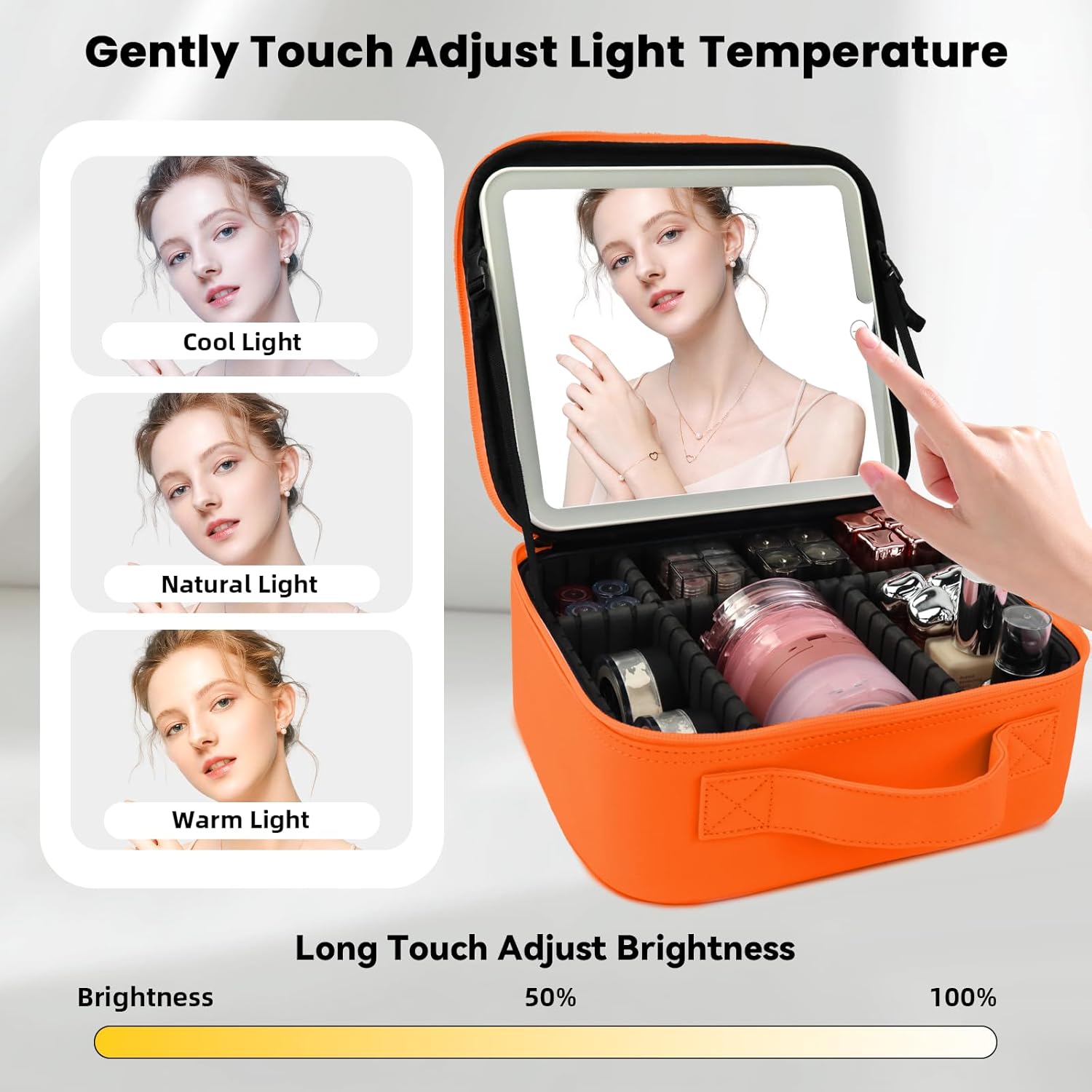 - 【Travel Makeup Bag with Led Mirror】Makeup case includes an 7.87 * 9in full-screen light mirror, Long press to control the brightness from 0% to 100% and gently touching the switch can easily adjust color temperature between cold light, natural light, and warm light, Can be attached to a makeup bag or placed on a desktop
