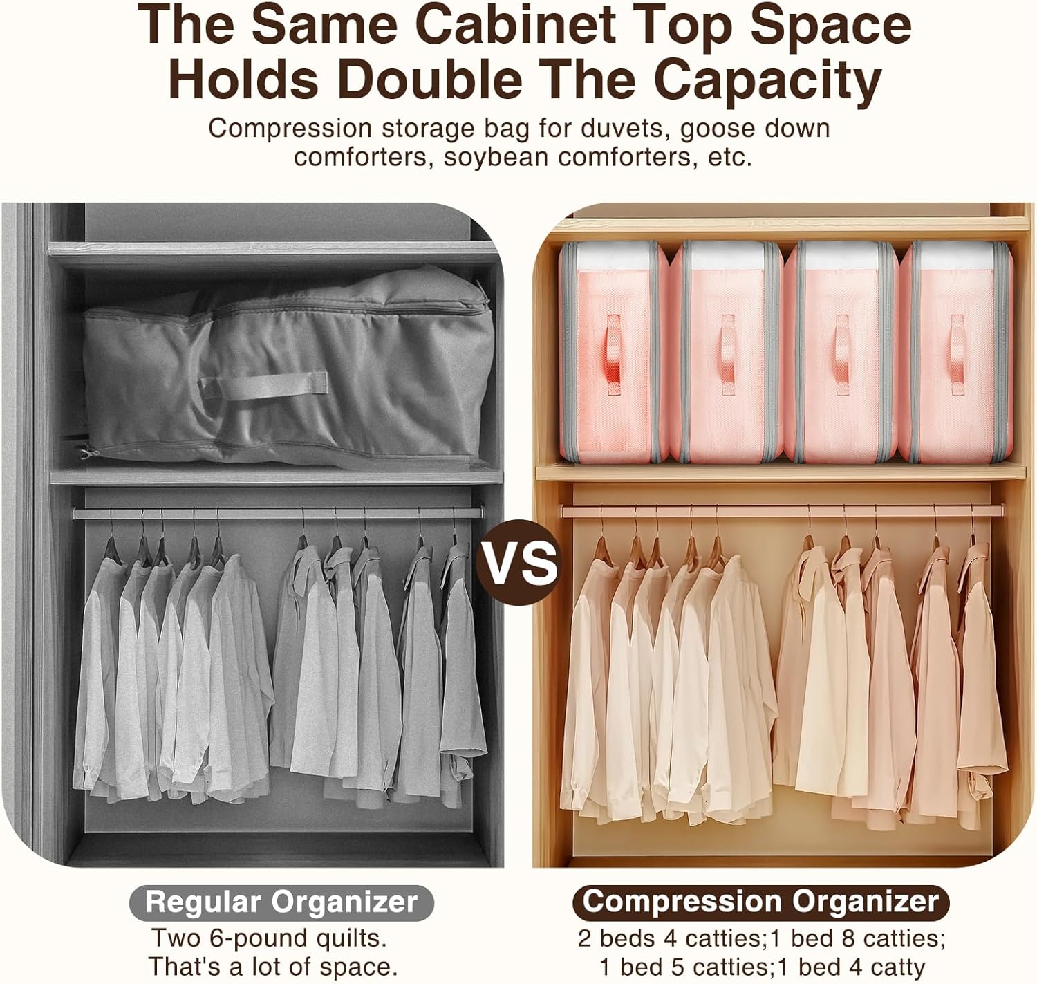 - [Large-Capacity Versatile Storage]: These compression clothing storage bags are ideal for storing comforters, blankets, winter coats, down jackets, sweaters, pillows, bed sheets, towels, scarves, and even seasonal clothing, adapting to all your storage needs. From bulky duvets to lightweight quilts, they accommodate a wide range of items. The ultra space saving self compression design maximizes closet or under-bed space, keeping everything compact, organized, and protected