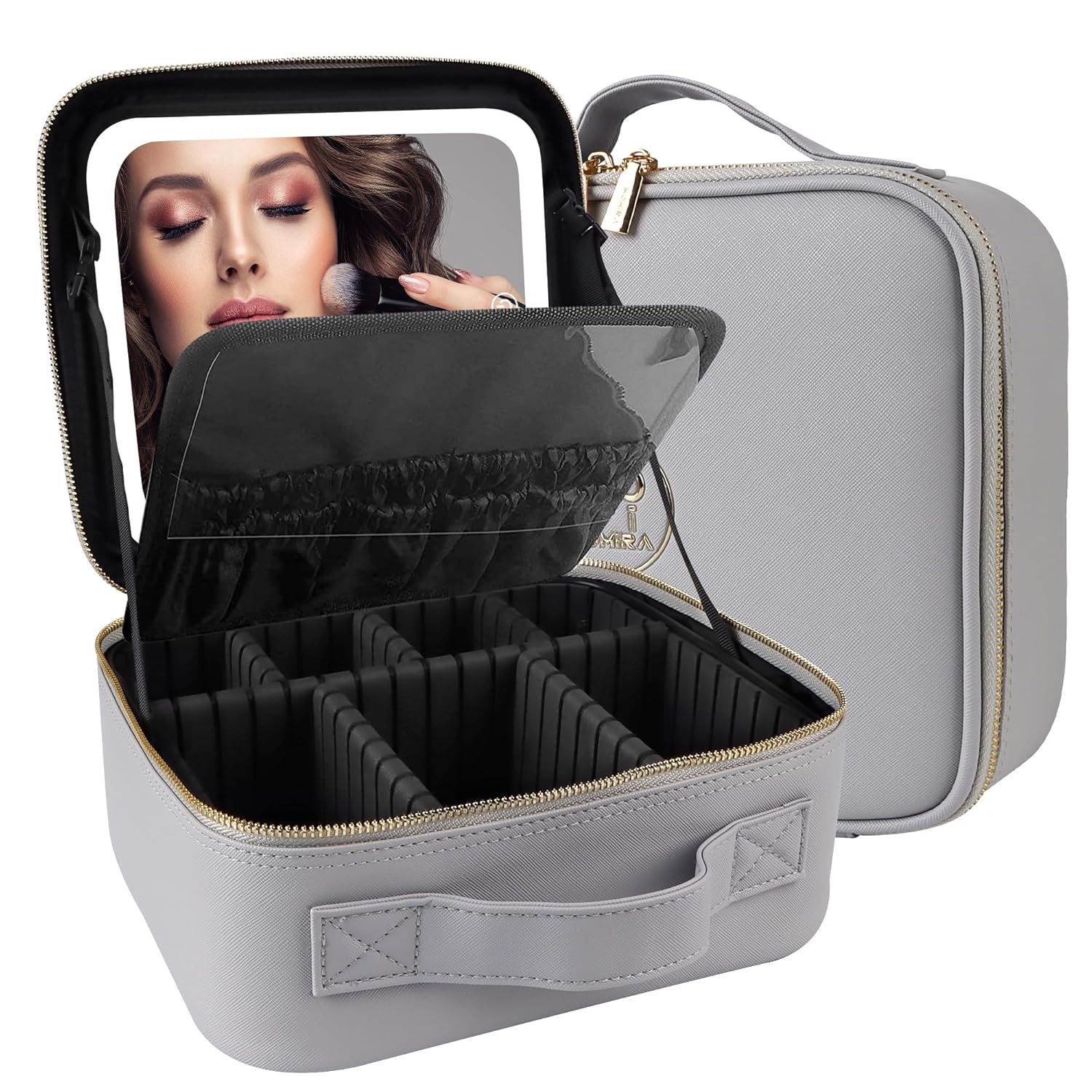 MOMIRA Travel Makeup Bag Cosmetic Bag Makeup Organizer Bag with Lighted Mirror, Adjustable Brightness in 3 Color Scenarios, Waterproof Makeup Train Case, Gift for Women - Grayish
