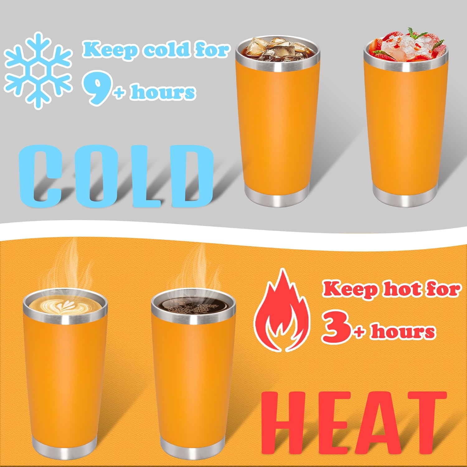 - DOUBLE WALL VACUUM INSULATED - The travel coffee tumblers use double wall vacuum insulated design, which can isolate the transfer of heat and cold. The tumbler can keep hot for over 3 hours and keep cold for over 9 hours, suitable for water, coffee, juice, cola and so on. You can enjoy your on the go drinks throughout your travels or commutes