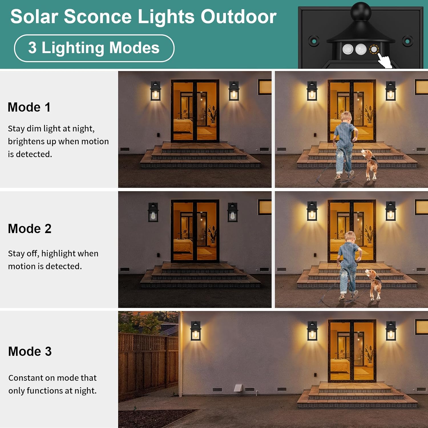 - 【3 Motion Sensor Lighting Modes】This solar wall light has 3 working modes. Mode 1: Stay dim light at night, brightens up when motion is detected. Mode 2: Remains off and is activated by motion at night. Mode 3:Constant on mode that only functions at night. You can choose different modes to meet your needs.