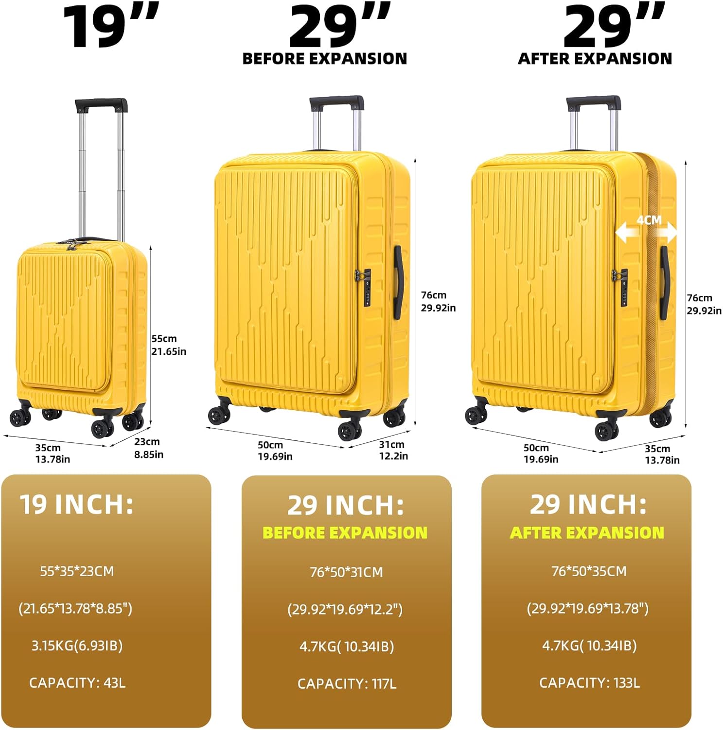 - Packing 2 pieces 19/29 Set: The Kaleenie set is a 2 pieces 19/29 Inch set. One store in another. The size for 19 inch carry on suitcase is 35*23*55cm(21.65*13.78*8.85"), 3.1Kg(6.3Ib), about 43L capacity. The 29 inch luggage size before expansion is 50*31*76cm(19.69*12.20*29.92”), 117L, total 62 linear inches (157cm), after expansion the size is 51*35*76cm(19.69*13.78*29.92”), 133L, total 63.5linear inches(161cm).