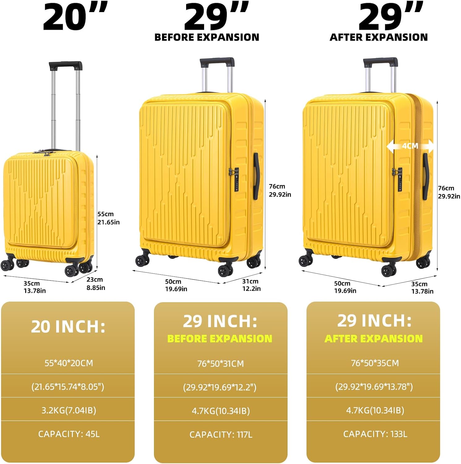 2 Pieces 20/29 Luggage Sets, 20 Inch Cabin Luggage with Front Pocket & 29 Inch Side Opening Suitcase, Ligthweight ABS+PC Hardshell, TSA Lock with HINOMOTO 360° Wheels, Yellow