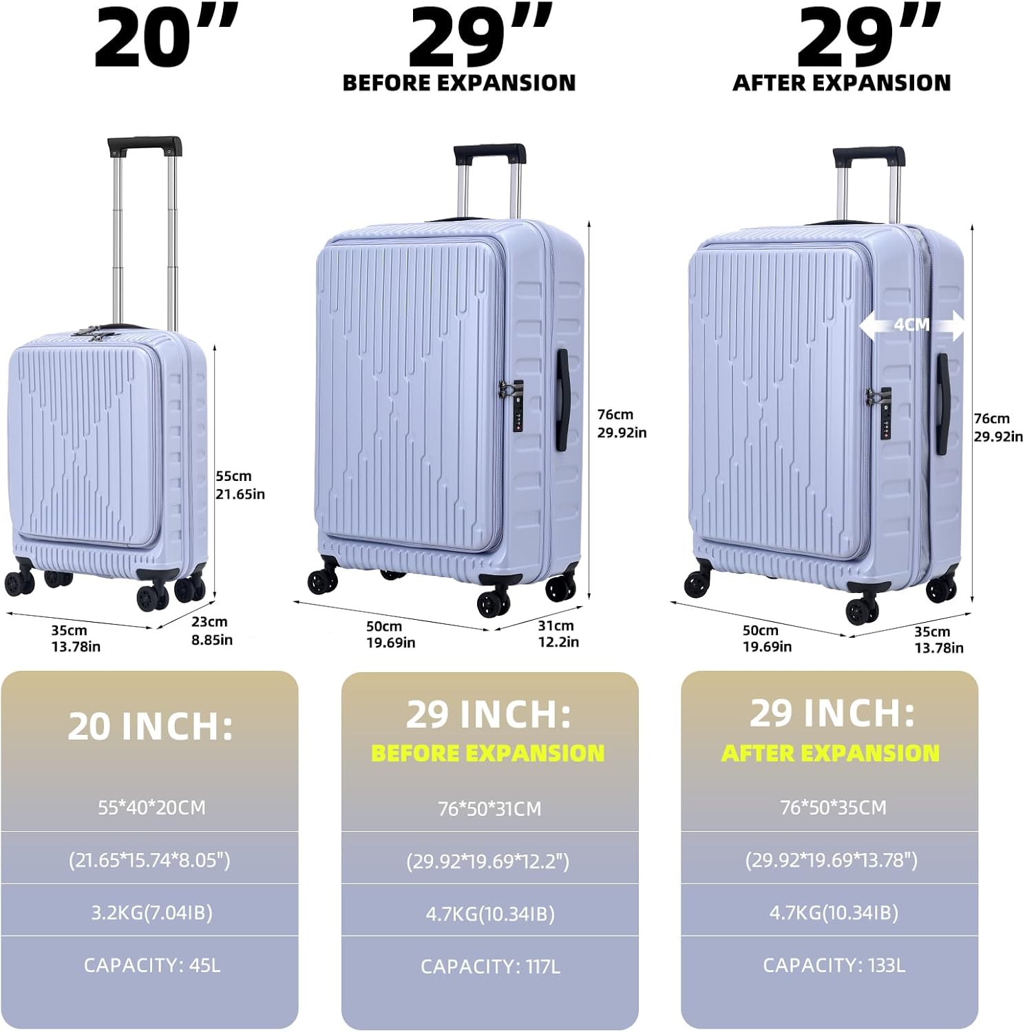 - Packing 2 pieces 20/29 Set: The Kaleenie set is a 2 pieces 20/29 Inch set. One store in another. The size for 20 inch carry on suitcase is: 40*20*55cm(21.65*15.74*8.85"), 3.2Kg(6.4Ib), 37L capacity. The 29 inch luggage size before expansion is 50*31*76cm(19.69*12.20*29.92”), 117L, total 62 linear inches (157cm), after expansion the size is 51*35*76cm(19.69*13.78*29.92”), 133L, total 63.5linear inches(161cm).