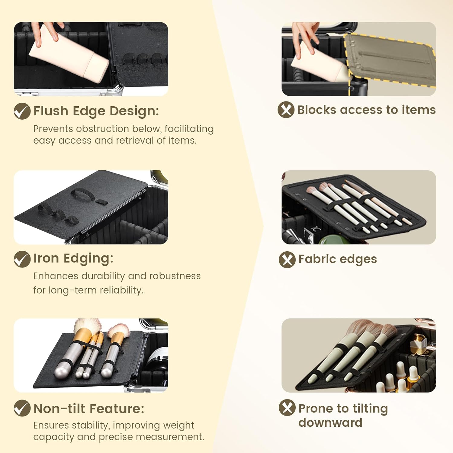 - 【ALL-IN-ONE MAKEUP BOX ORGANIZER】- This makeup box features six removable EVA partitions and two brush storage boards for tailored organization. The shock-absorbing sponge pads safeguard your cosmetics, while the partitions are waterproof and simple to maintain.