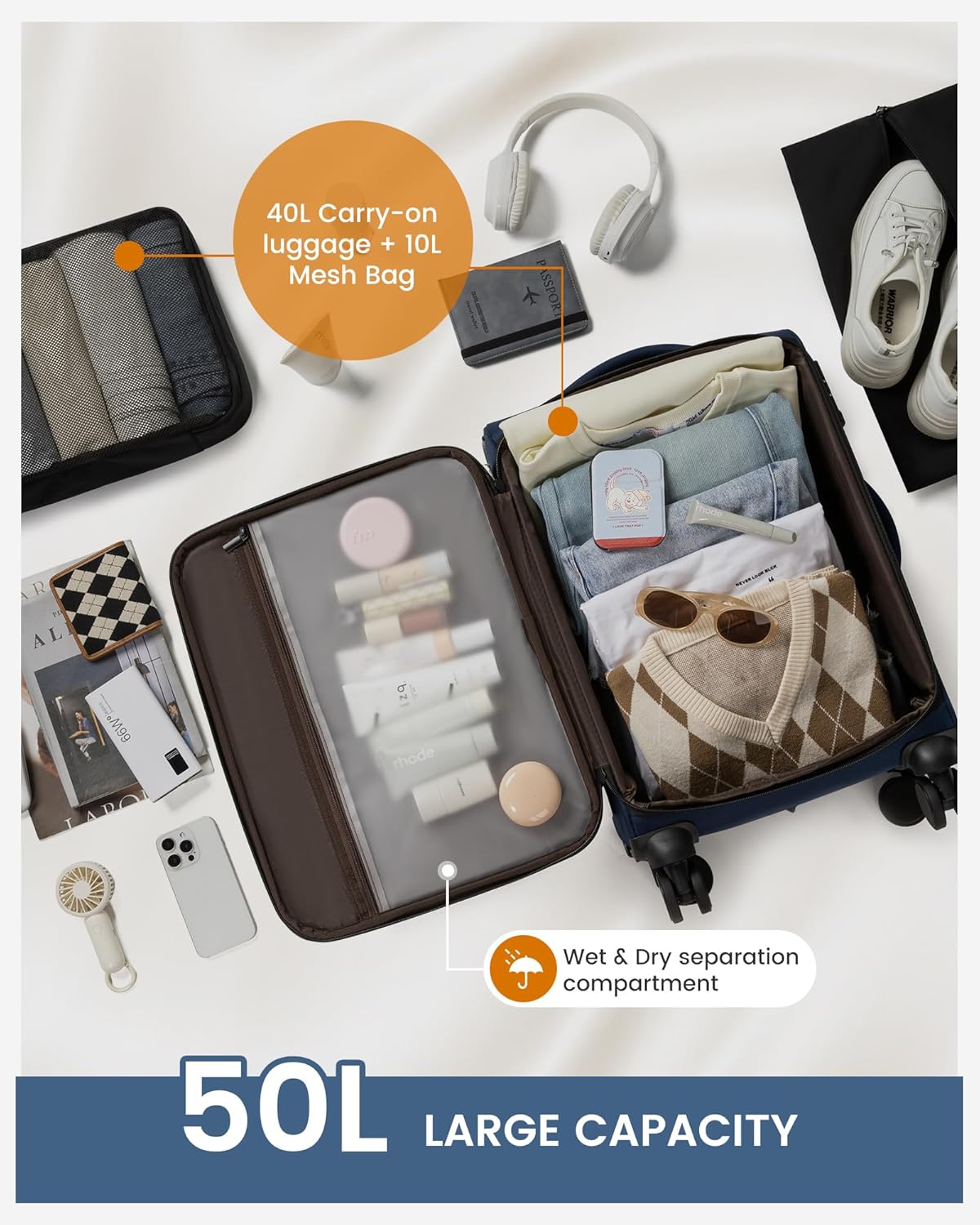 - SMART PACKING FEATURES: This carry on luggage includes 2 bonus storage bags (one shoe bag and one 10L clothes pouch) and a wet compartment for damp items. It keeps your packing neat, organized, and protected for both short and long trip.