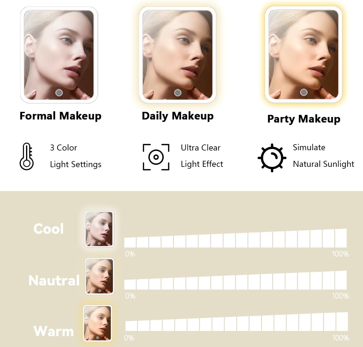 - 【Removable & Adjustable brightness High Definition LED mirror】:3 lighting modes and 0-100% adjustable brightness that can be switched. With a long press on the switch, and a short press can adjust the color temperature between cool, natural and warm light.The makeup mirror is firmly attached to the makeup bag by Velcro and can be disassembled for separate use, and the makeup mirror comes with a separate stand that can be conveniently placed on the table according to your needs.