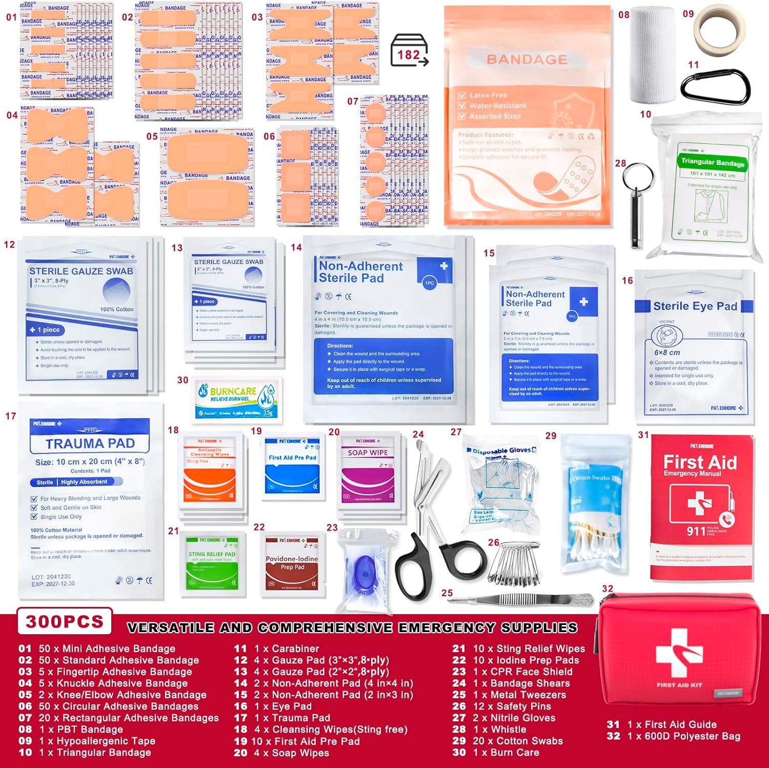 - ALL-IN-ONE EMERGENCY ESSENTIALS: This compact first aid kit contains 300 premium-quality medical and survival supplies including bandages, povidone-lodine prep pads, gloves, tweezers, tourniquets, gauze, and more. 100% latex-free, safe for adults and kids—perfect for handling minor cuts, scrapes, and other emergencies.