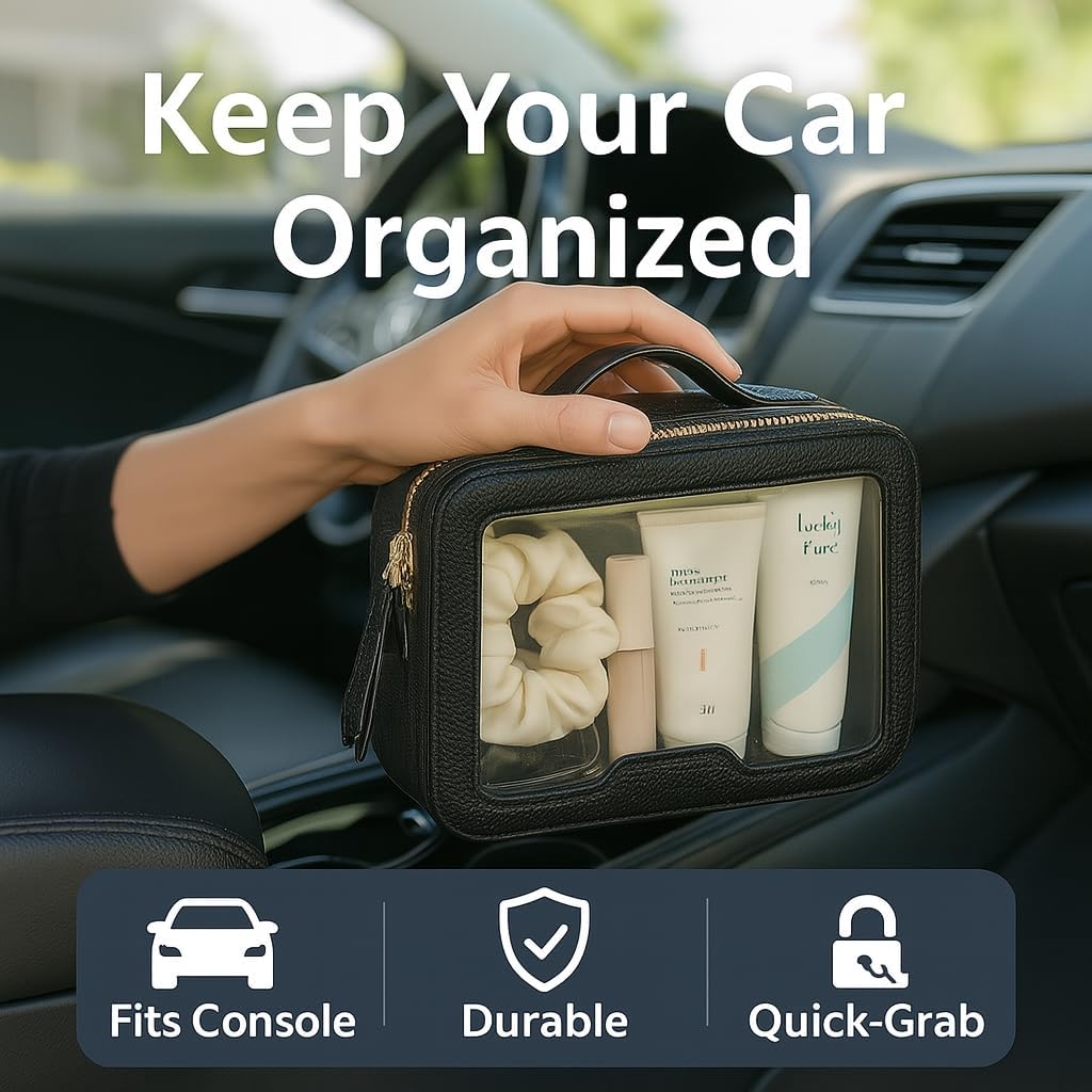 - Perfect for Car Consoles: This compact car bag organizer fits perfectly in center consoles or glove boxes, maximizing space while keeping clutter under control. Use it as a clear makeup pouch to store daily must-haves like foundation, lipstick, hand cream, hair ties, or even a small mirror