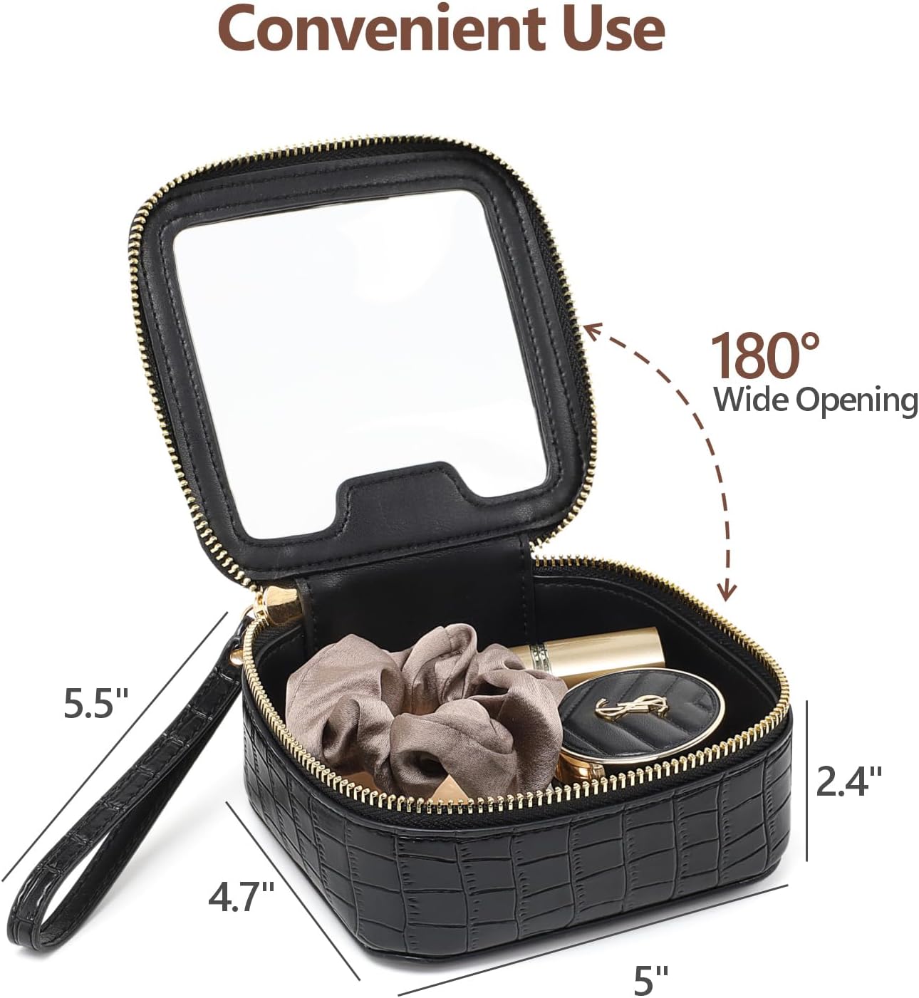 - Premium Quality: Features a 180° wide opening for easy access to makeup items. Includes a PU leather wrist strap for easy carrying. The reinforced PU leather and soft transparent plastic ensure the bag is tear-resistant, splash-proof, and easy to clean. Smooth zipper for hassle-free use