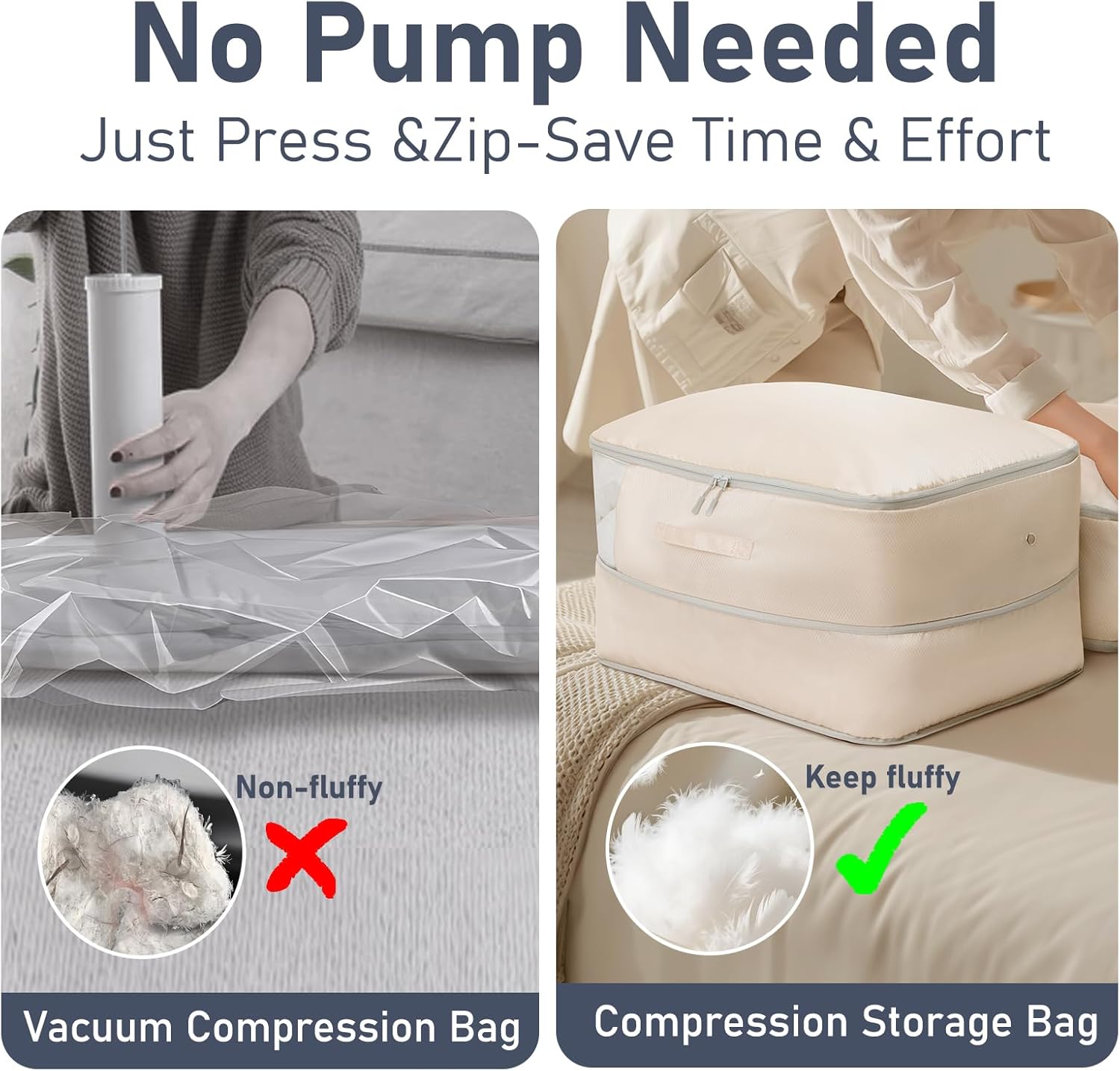 - Innovative Compression Storage Bags:Our compression organizer keeps the air inside during compression, protecting the fibers and down in your clothes and comforters from damage. Save space while ensuring that your items remain fluffy and as good as new when you open them the following year! They can be safely stored in your attic or basement. The dimensions of the compression bags are 11.8 inches (compressed: 5.9) x 16.54 inches x 21.26 inches