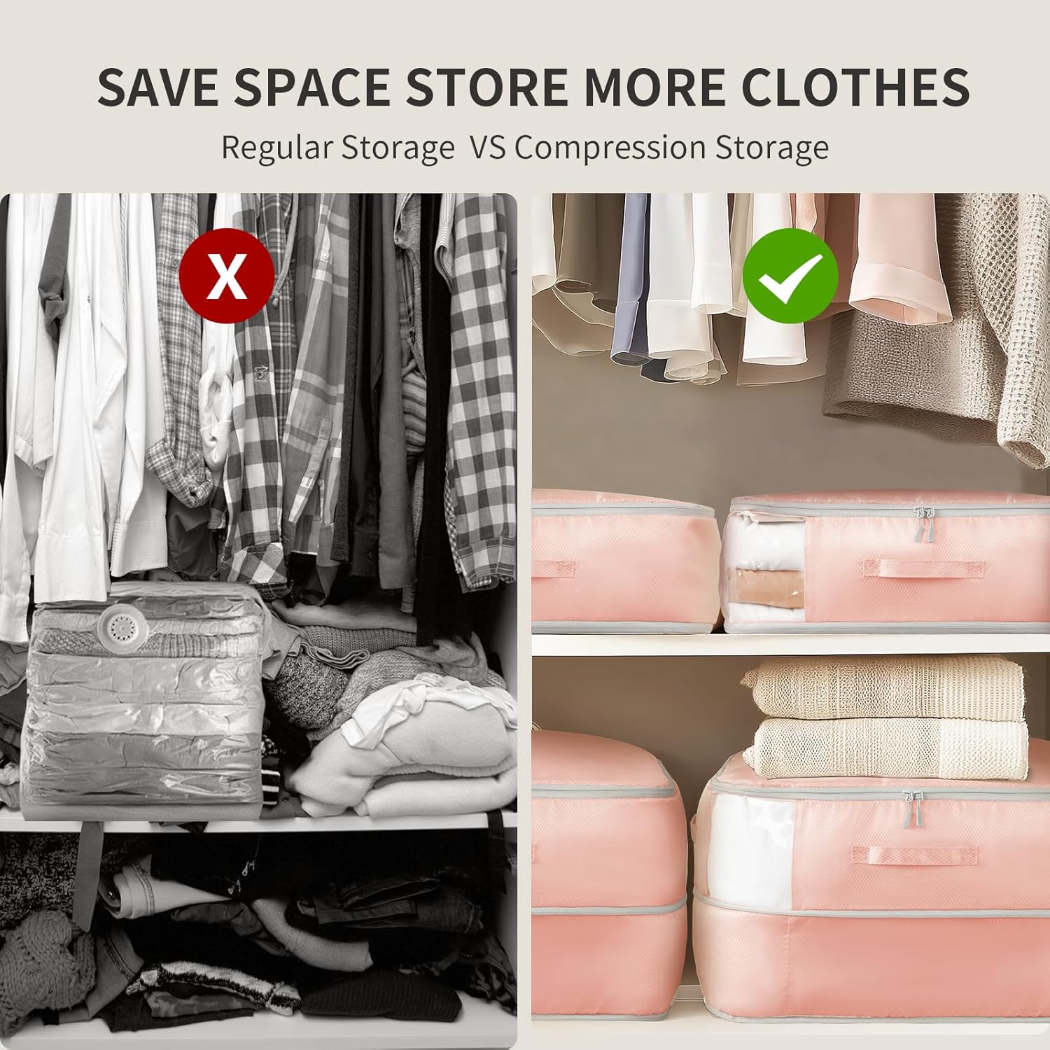 - Innovative Compression Storage Bags:Our compression organizer keeps the air inside during compression, protecting the fibers and down in your clothes and comforters from damage. Save space while ensuring that your items remain fluffy and as good as new when you open them the following year! They can be safely stored in your attic or basement. The dimensions of the compression bags are 11.8 inches (compressed: 5.9) x 16.54 inches x 21.26 inches