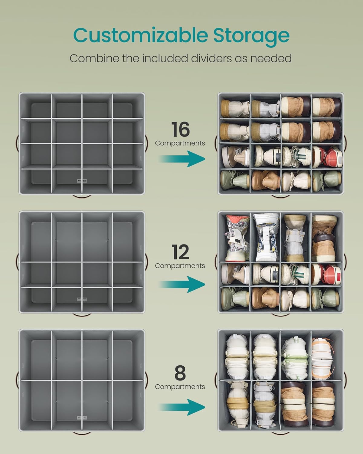 - Customisable: Flexible dividers allow compartments to adjust according to shoe size. These storage boxes can hold shoes, clothes, and bags of different sizes