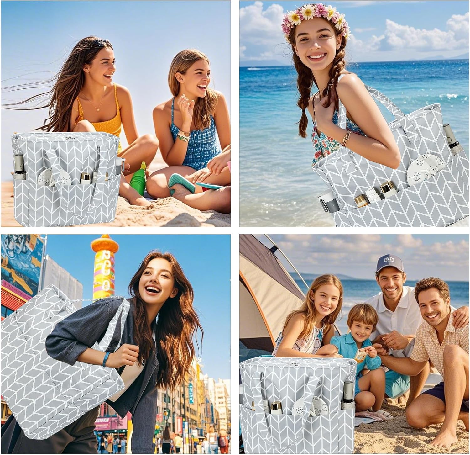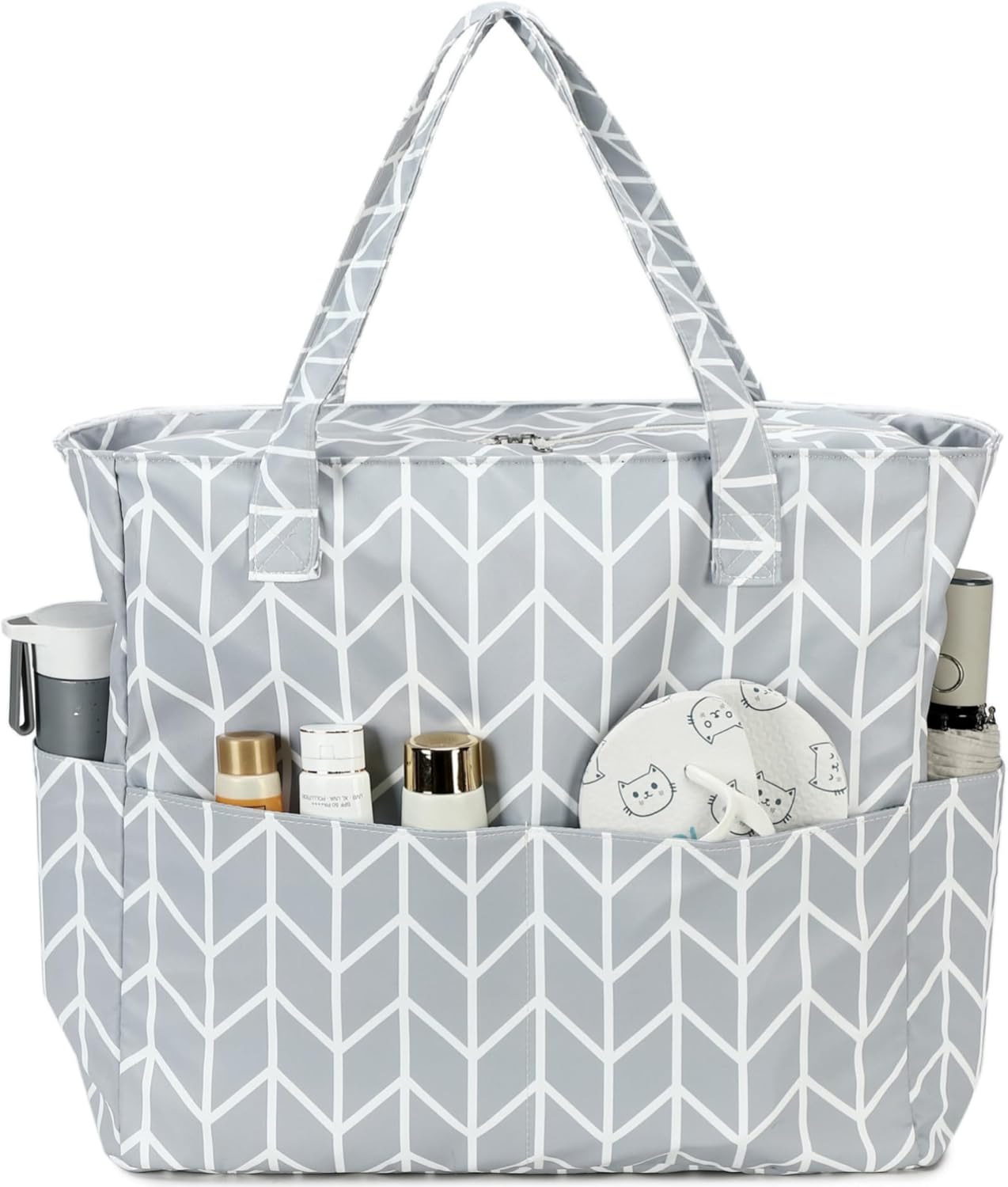 - Tote Bag with Zipper perfect for carrying when you step out for beach, travel, weekender, swimming, pool, gym, s hopping, picnic since it folded up small and lightweight, can be tucked in your backpack or luggage case easily. Also a good choice for reusable grocery tote, diaper bag, carry-on bag, travel bag, storage bag, really a super practical beach bag for women, grab one of them, it will not let you down.