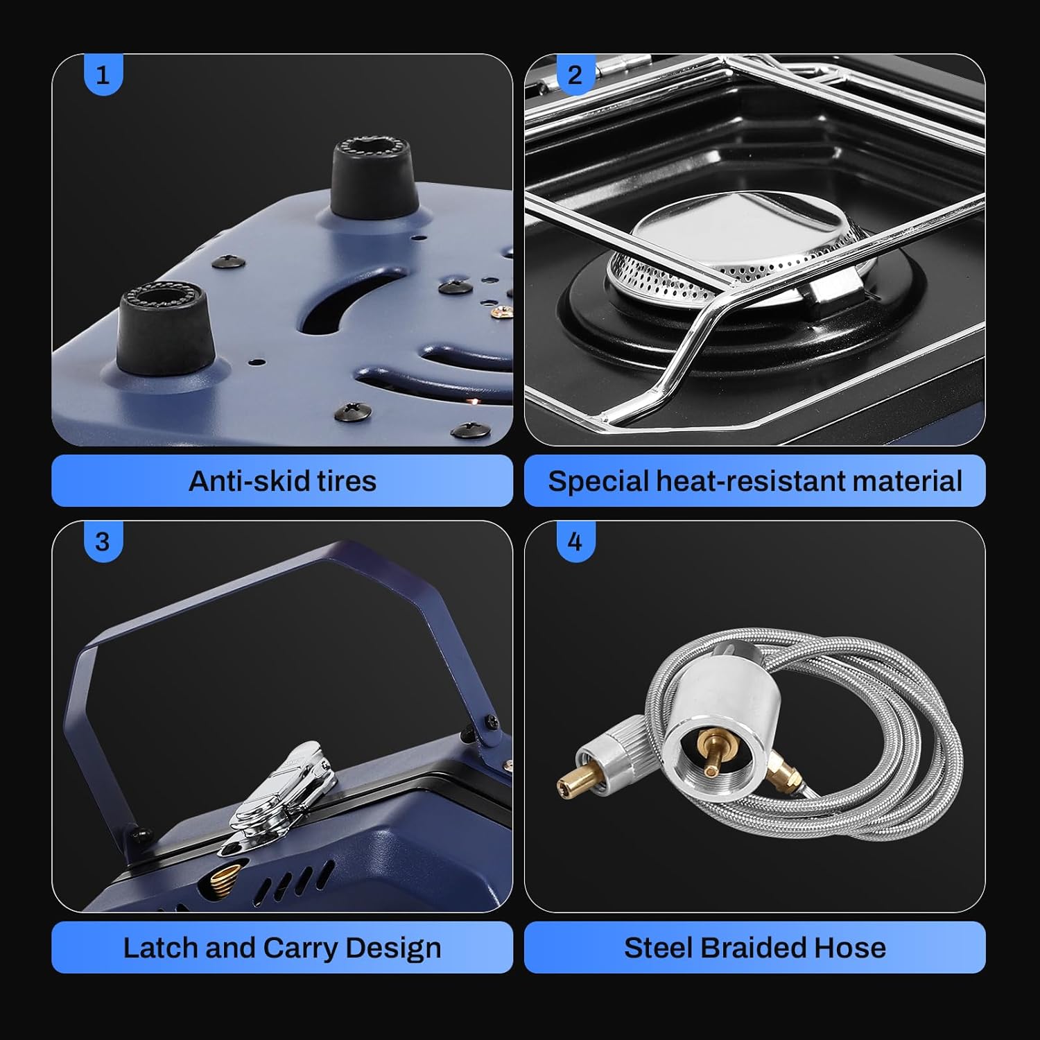 - DURABLE CONSTRUCTION: The folding camping stove is made of heat-resistant steel body to ensure sturdiness and durability; the surface of the stove and grill pan, are made of non-stick coating material, which is rust-resistant and non-stick. The propane stove is compatible with most propane bottles; we also use non-slip grates, as well as a snap-on design that won't move easily during use, providing excellent rust resistance and durability