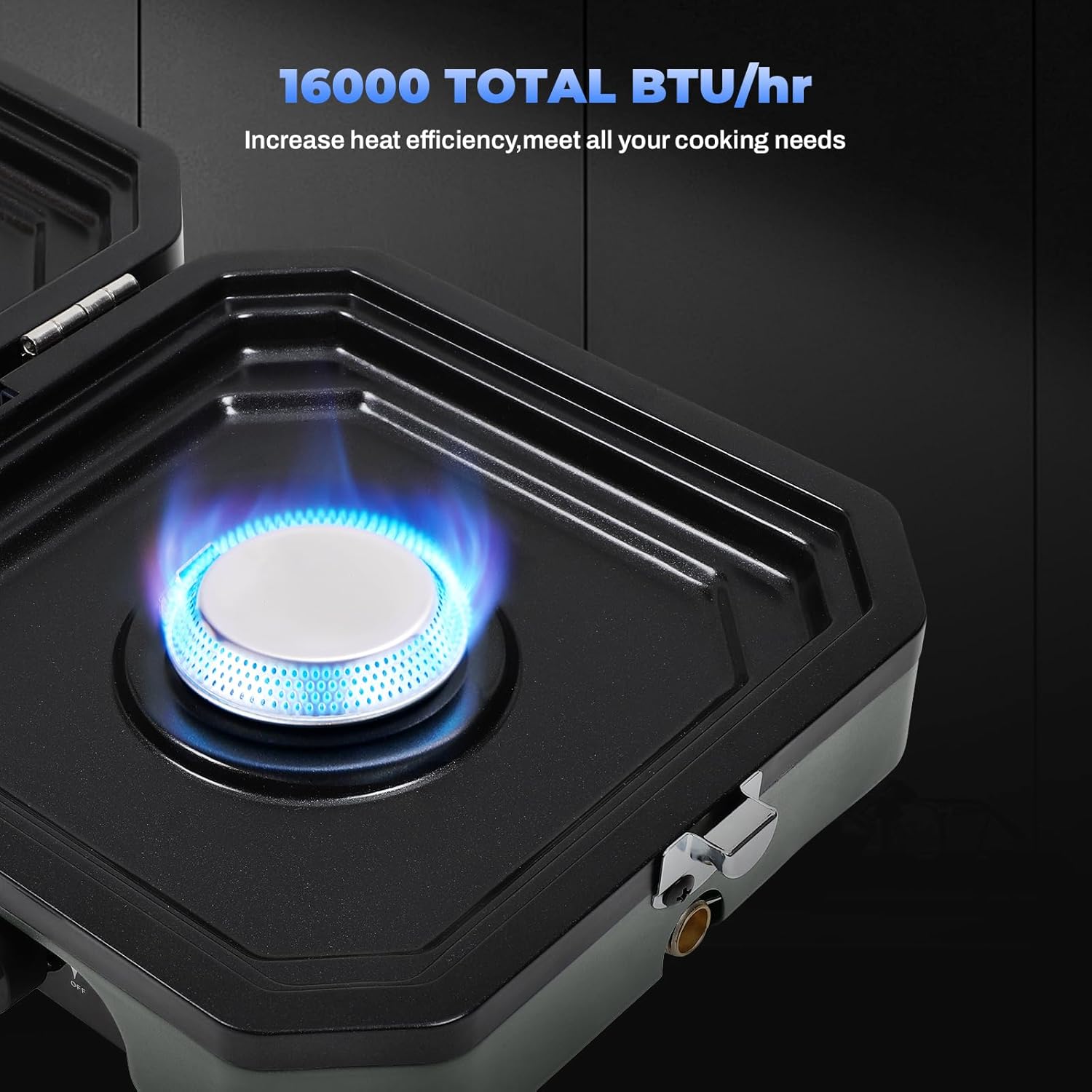 2-Burner Foldable Camping Stove with Griddle and Carrying Bag,16000 BTU Portable Propane Camp Stove with 2 Adjustable Burners & Piezo Ignition, for Camping, Home Backyard, Frying Turkey, Green