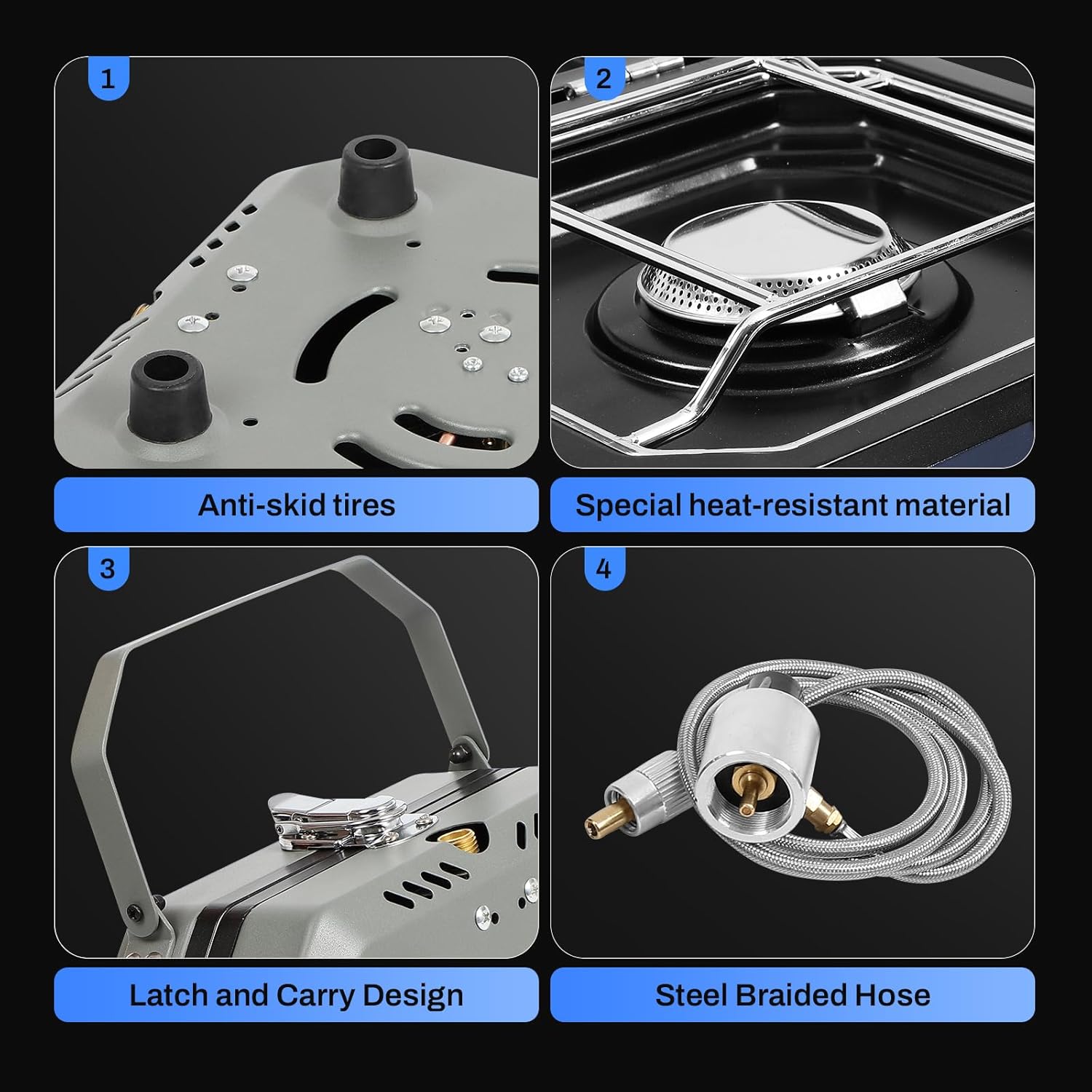 - DURABLE CONSTRUCTION: The folding camping stove is made of heat-resistant steel body to ensure sturdiness and durability; the surface of the stove and grill pan, are made of non-stick coating material, which is rust-resistant and non-stick. The propane stove is compatible with most propane bottles; we also use non-slip grates, as well as a snap-on design that won't move easily during use, providing excellent rust resistance and durability